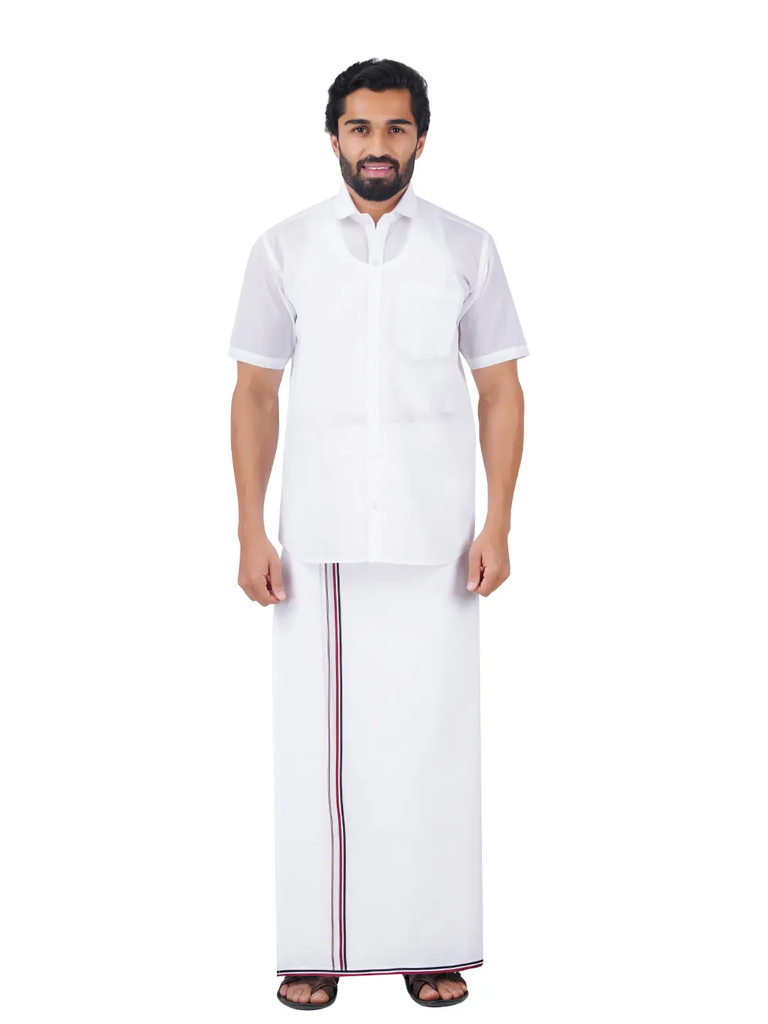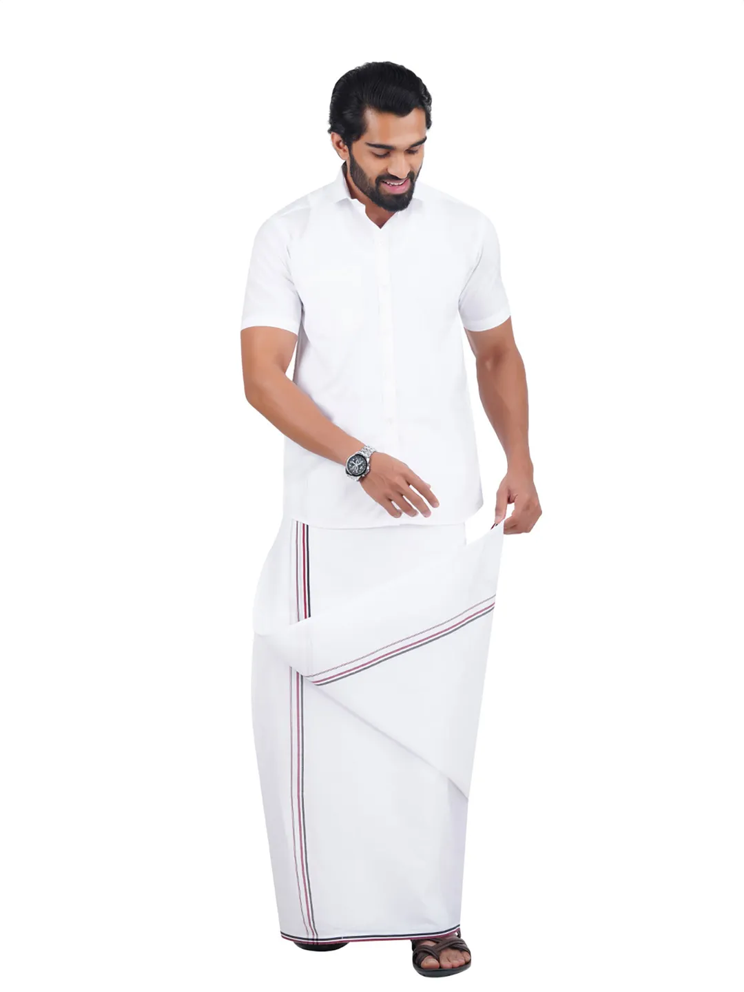 Product Details This Prakasam Cotton Men's White Colour Political Party Dhoti is a symbol of elegance and tradition. Crafted with fine quality materials, it exudes sophistication and charm. The dhoti's dimensions of 1.28 meters in length and 3.80 meters in width ensure a comfortable fit for any occasion. Whether worn at a political gathering or a celebratory event, this dhoti is sure to make a statement with its classic white color and impeccable craftsmanship. Step out in style and showcase your unique sense of fashion with this timeless piece.