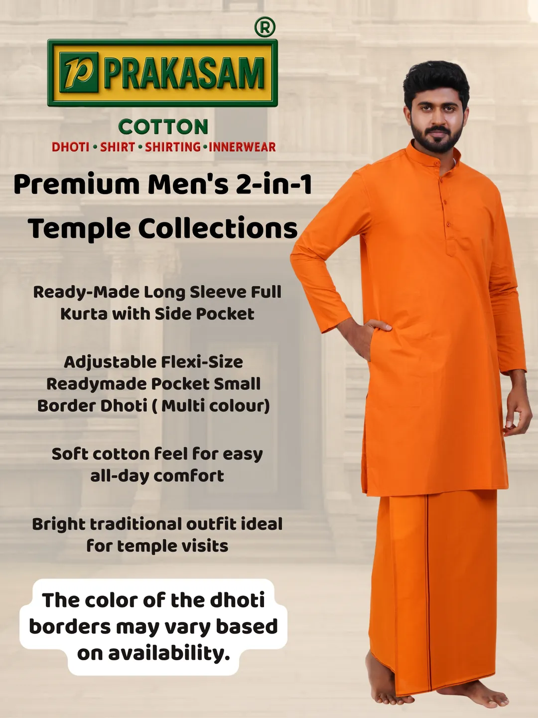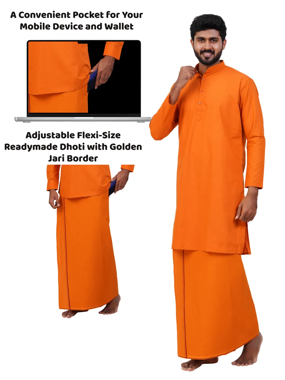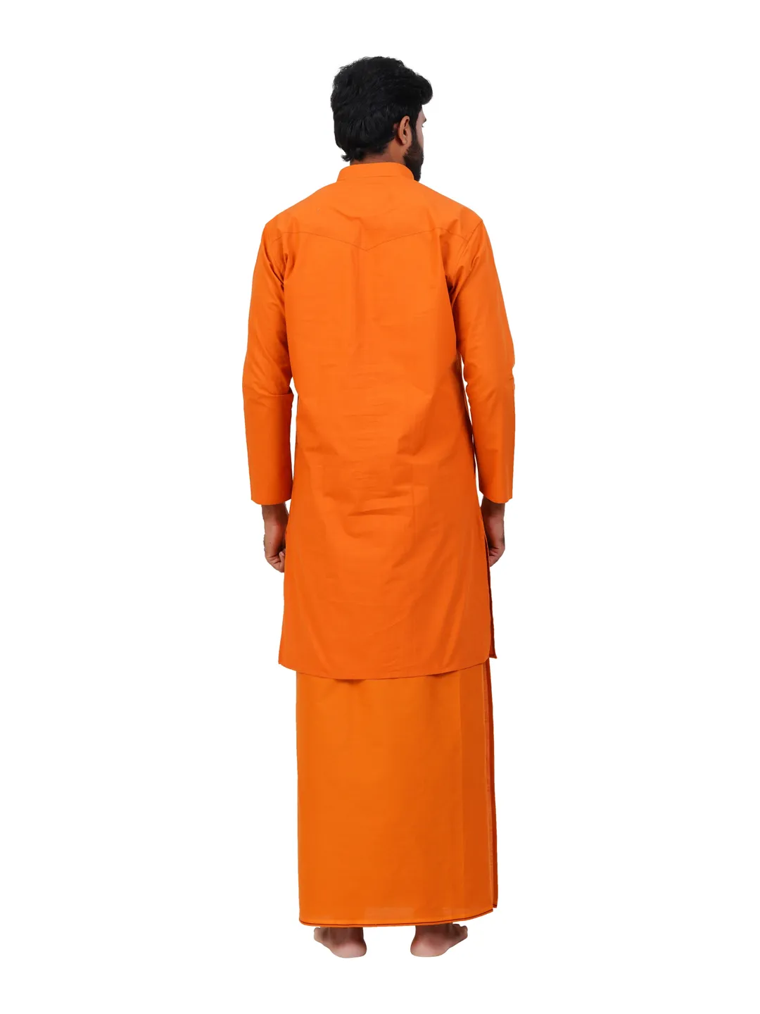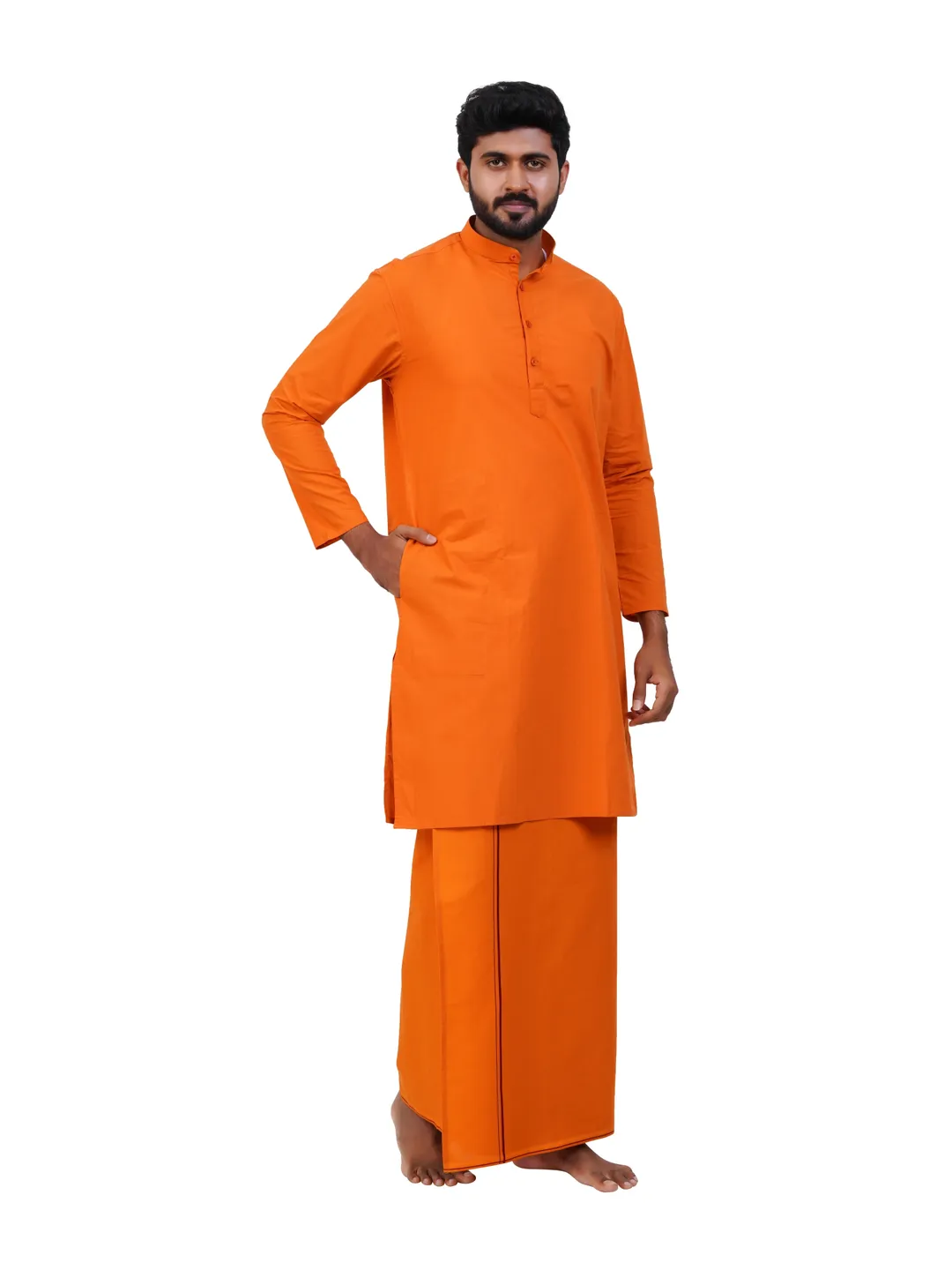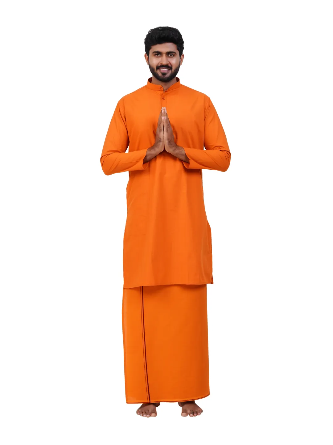 Aiyappa Collections Readymade Full Sleeve Kavi Colour kurta Shirt(Mandarin Coller) with Readymade Flexi Size Thin Border Kavi Dhoti (2 in 1) Set