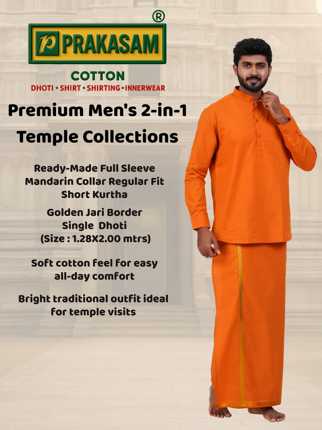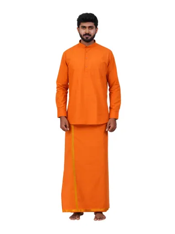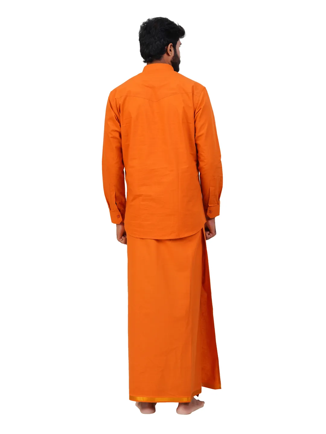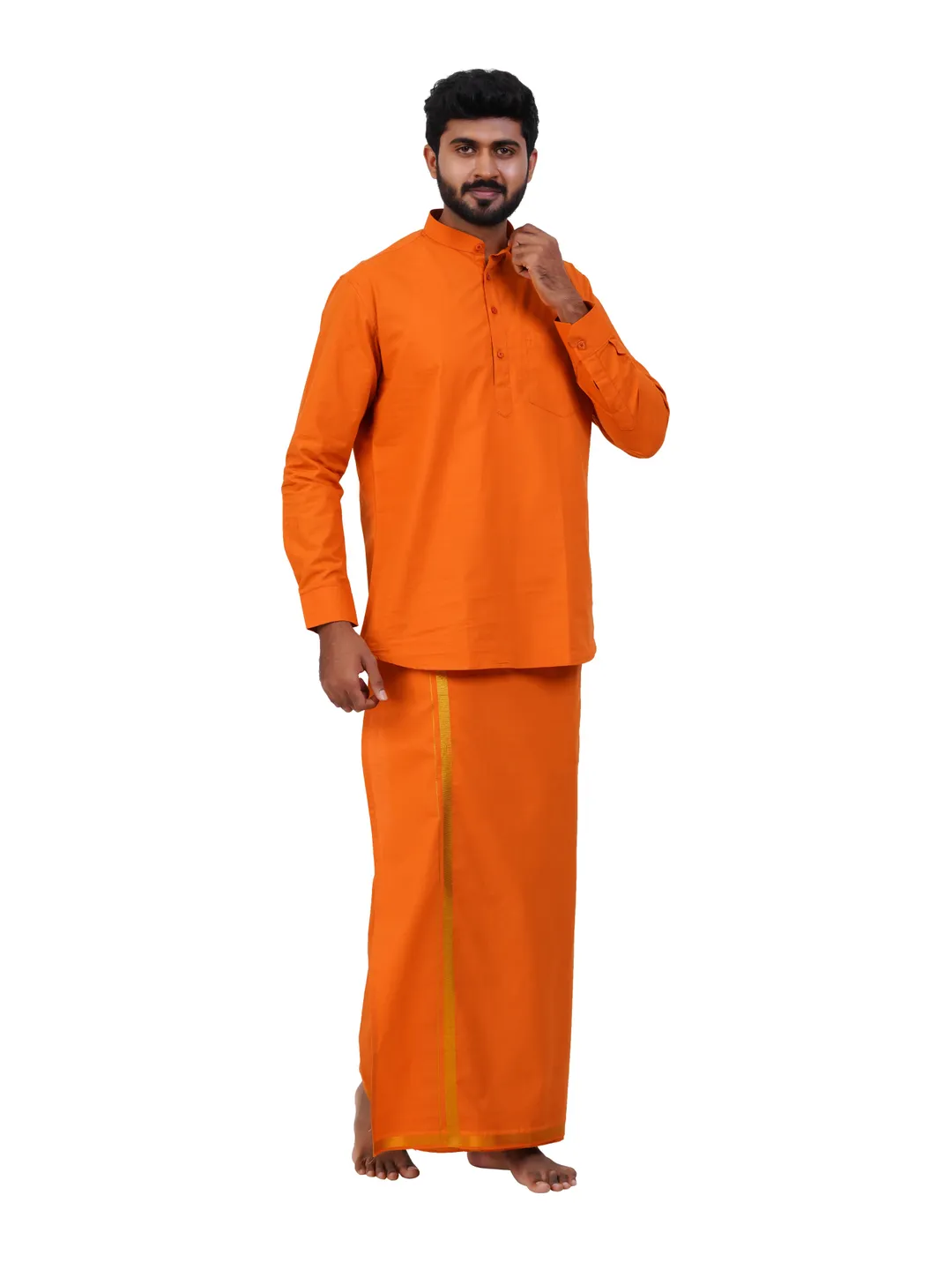 Aiyappa Collections Readymade Full Sleeve Kavi Colour Shirt(Mandarin Coller) with Single Gold Jari Border ( 1.28x2.00 mtrs) Kavi Dhoti (2 in 1) Set