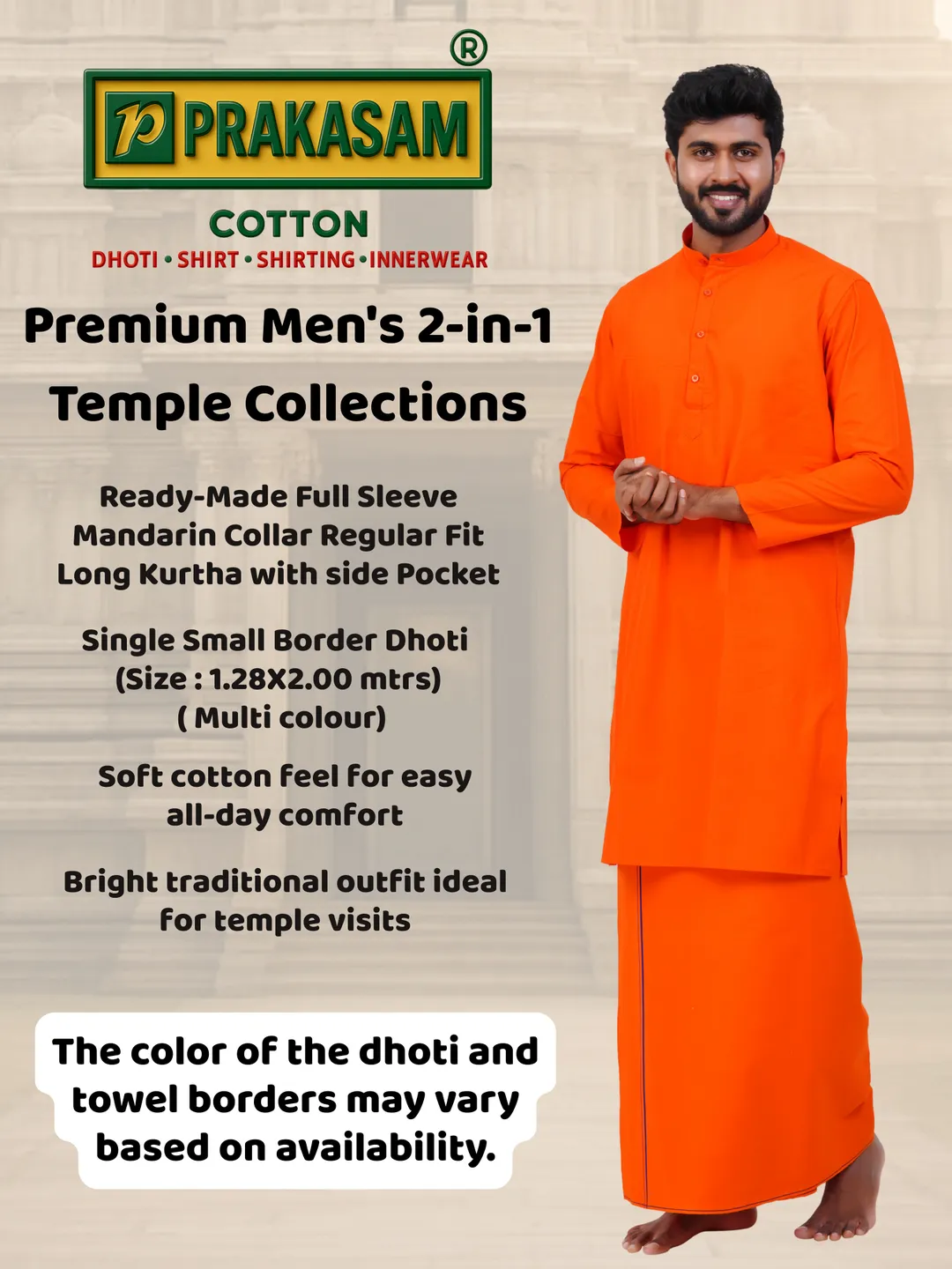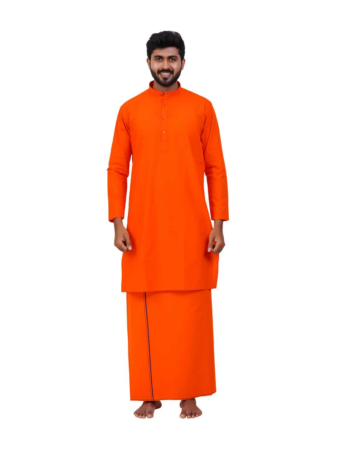 Aiyappa Collections Readymade Full Sleeve Orange Colour kurta Shirt(Mandarin Coller) with Single Thin Border ( 1.28x2.00 mtrs) Orange Dhoti (2 in 1) Set