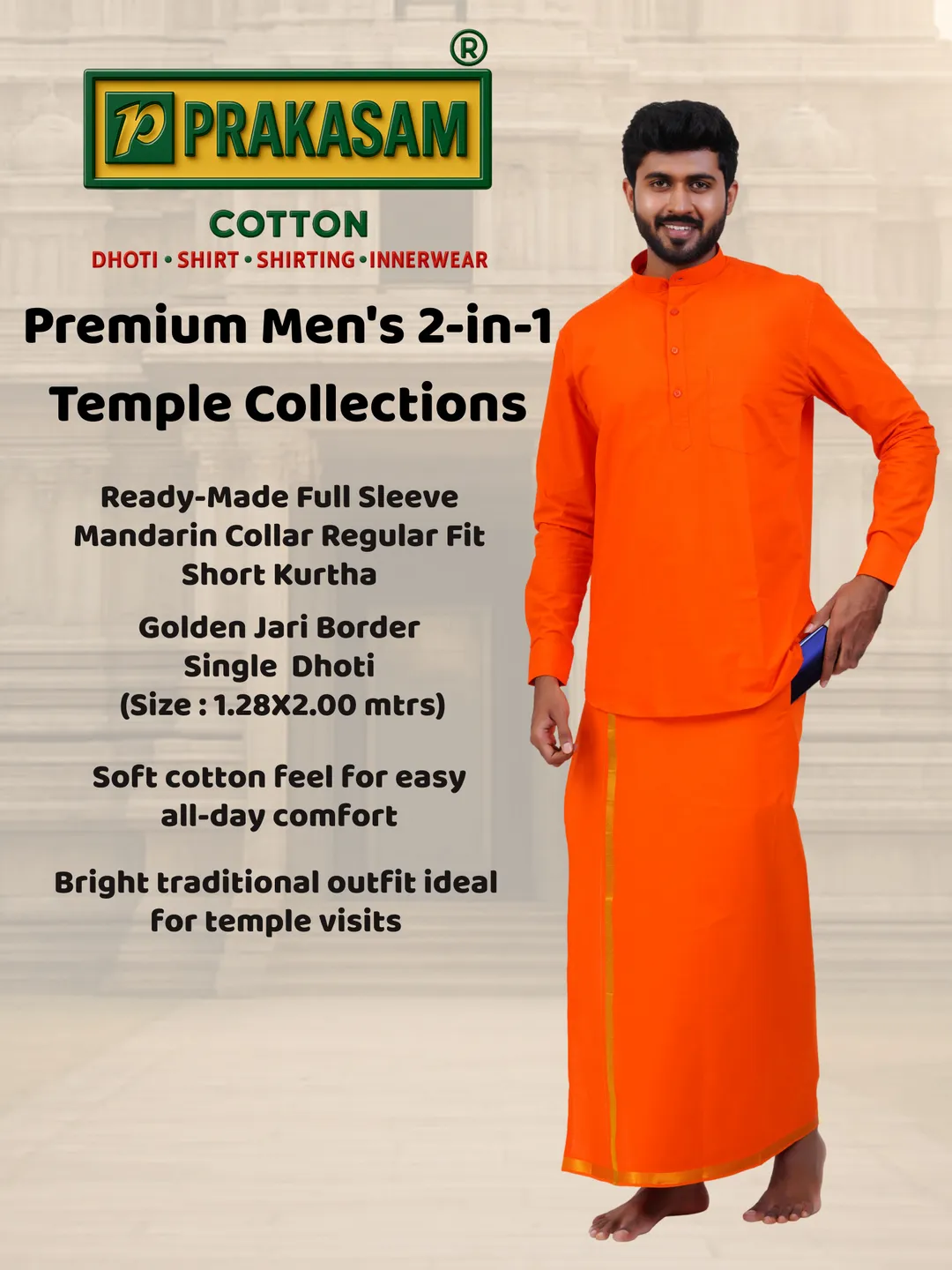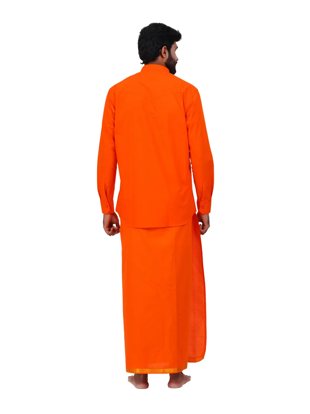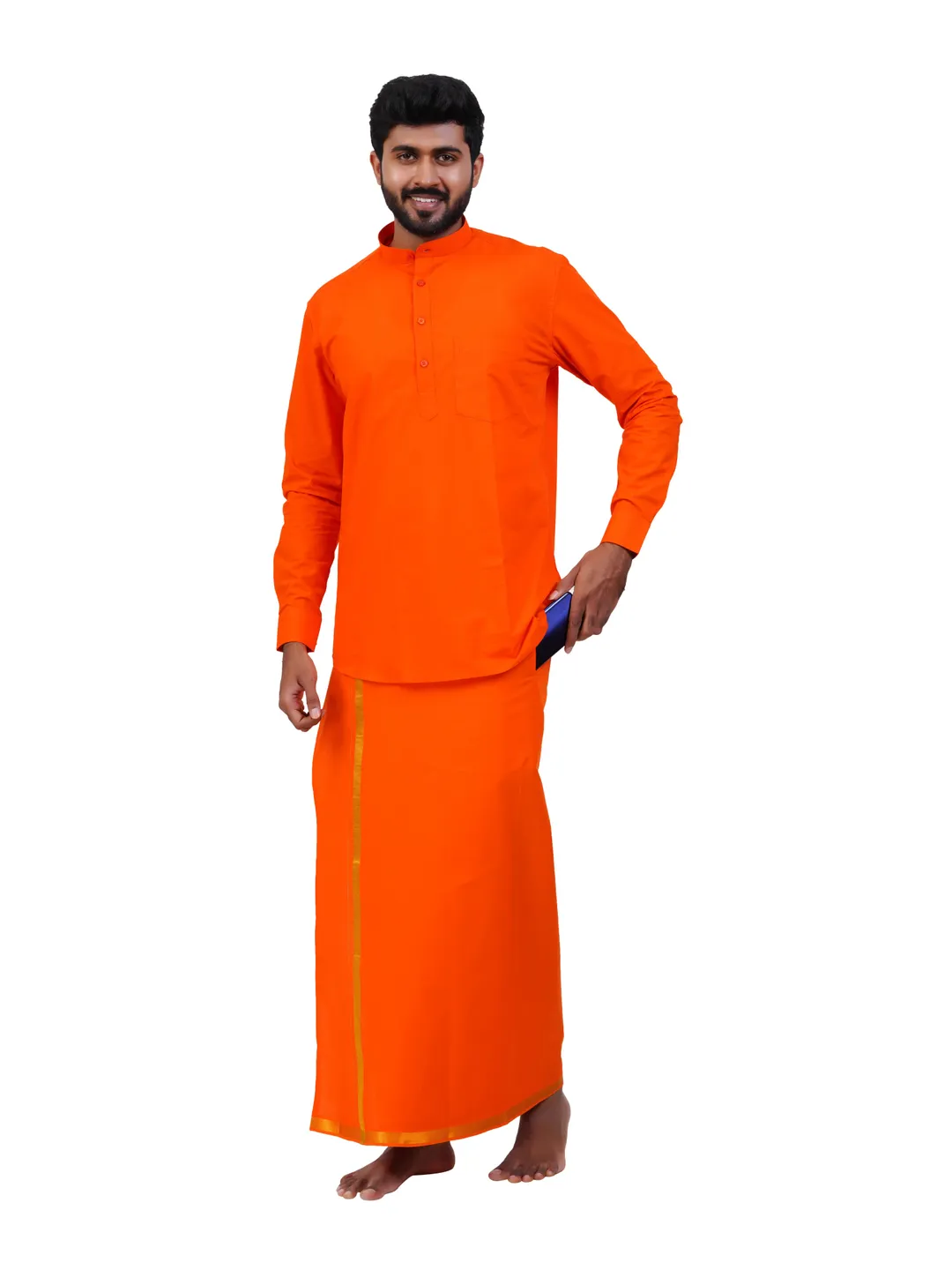 Aiyappa Collections Readymade Full Sleeve Orange Colour Shirt(Mandarin Coller) with Readymade Flexi Size Gold Jari Border Orange Dhoti (2 in 1) Set