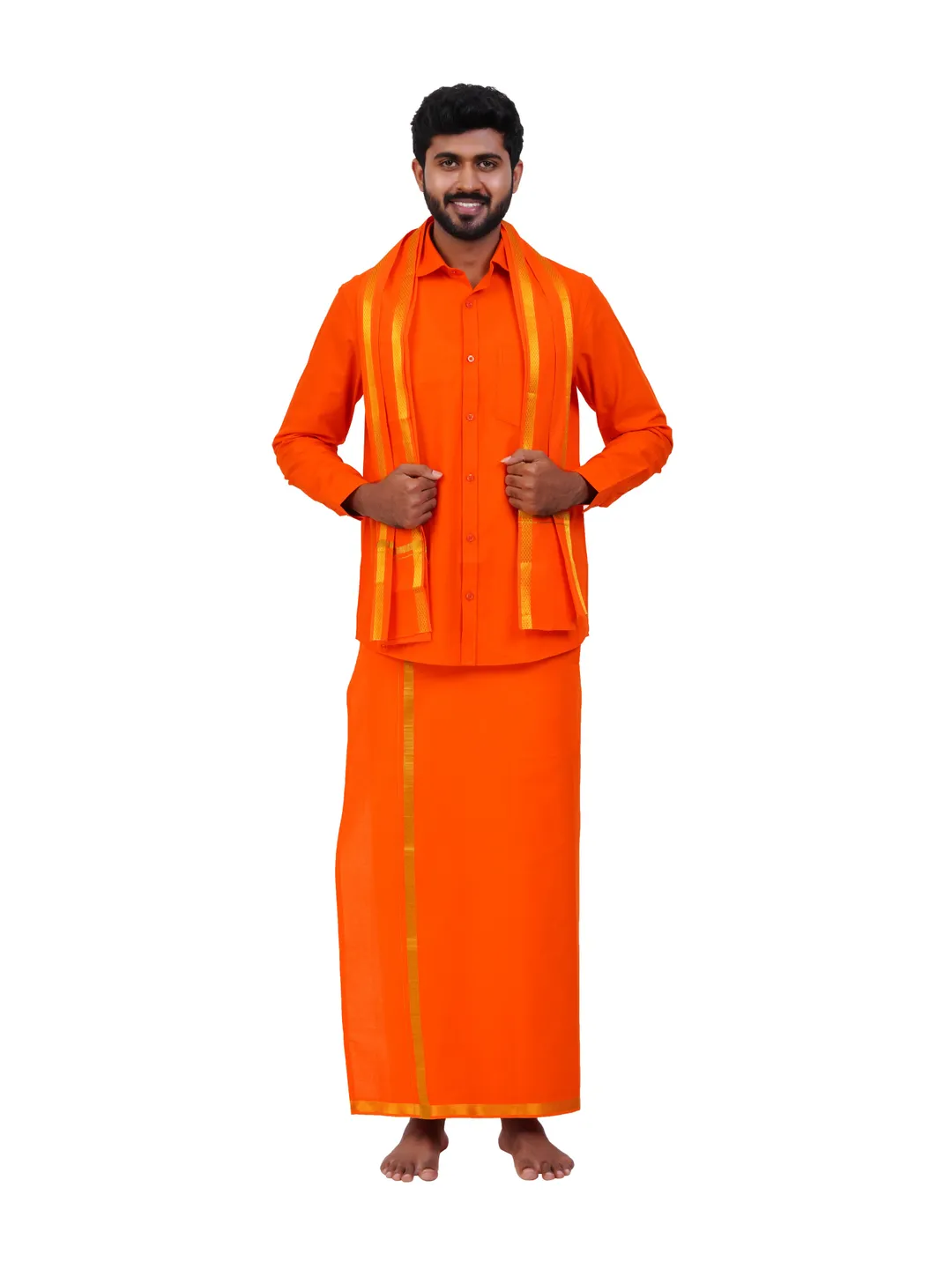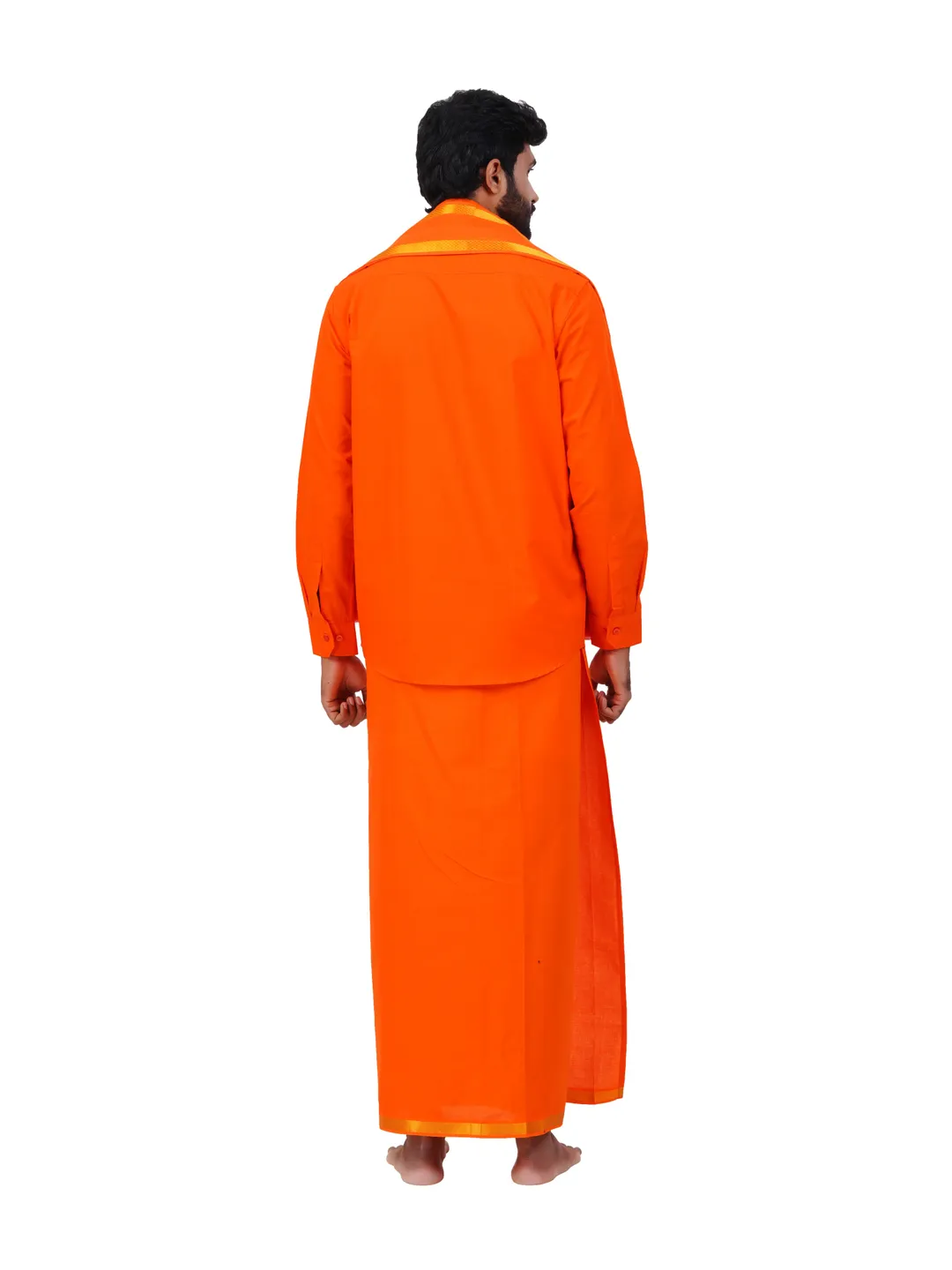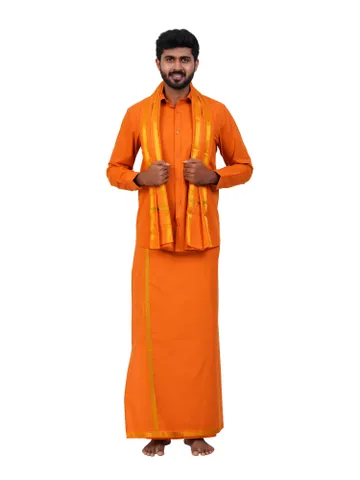 Aiyappa Collections Readymade Full Sleeve Orange Colour Shirt(Normal Coller) with Single Gold Jari Border ( 1.28x2.00 mtrs) Orange Colour Dhoti with Matching Towel 3 in 1 Set