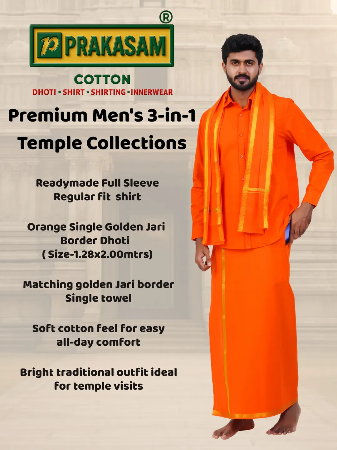 The Prakasam cotton dhoti, featuring a single jari border (1.28X2.00 m), exudes timeless charm and sophistication. When paired with a ready-made Full-sleeve Orange shirt, this outfit strikes a perfect balance between comfort and style. The addition of a matching towel with a Orange jari border elevates the overall look, creating a cohesive ensemble that is both dignified and fashionable. This set not only represents traditional Indian attire but also embodies elegance and simplicity. Whether for a temple visit, festival, or cultural event, this ensemble is sure to leave a lasting impression with its classic appeal and thoughtful design.