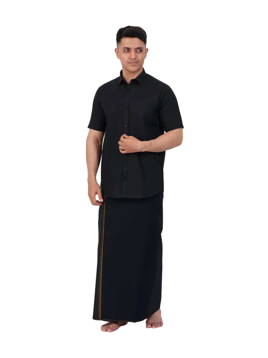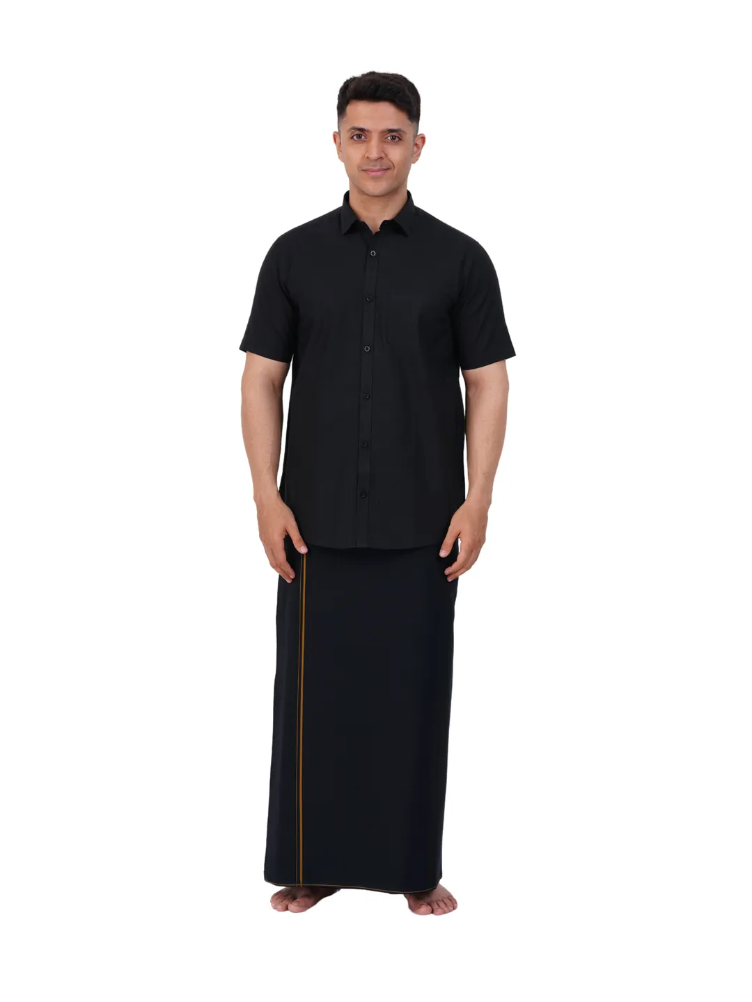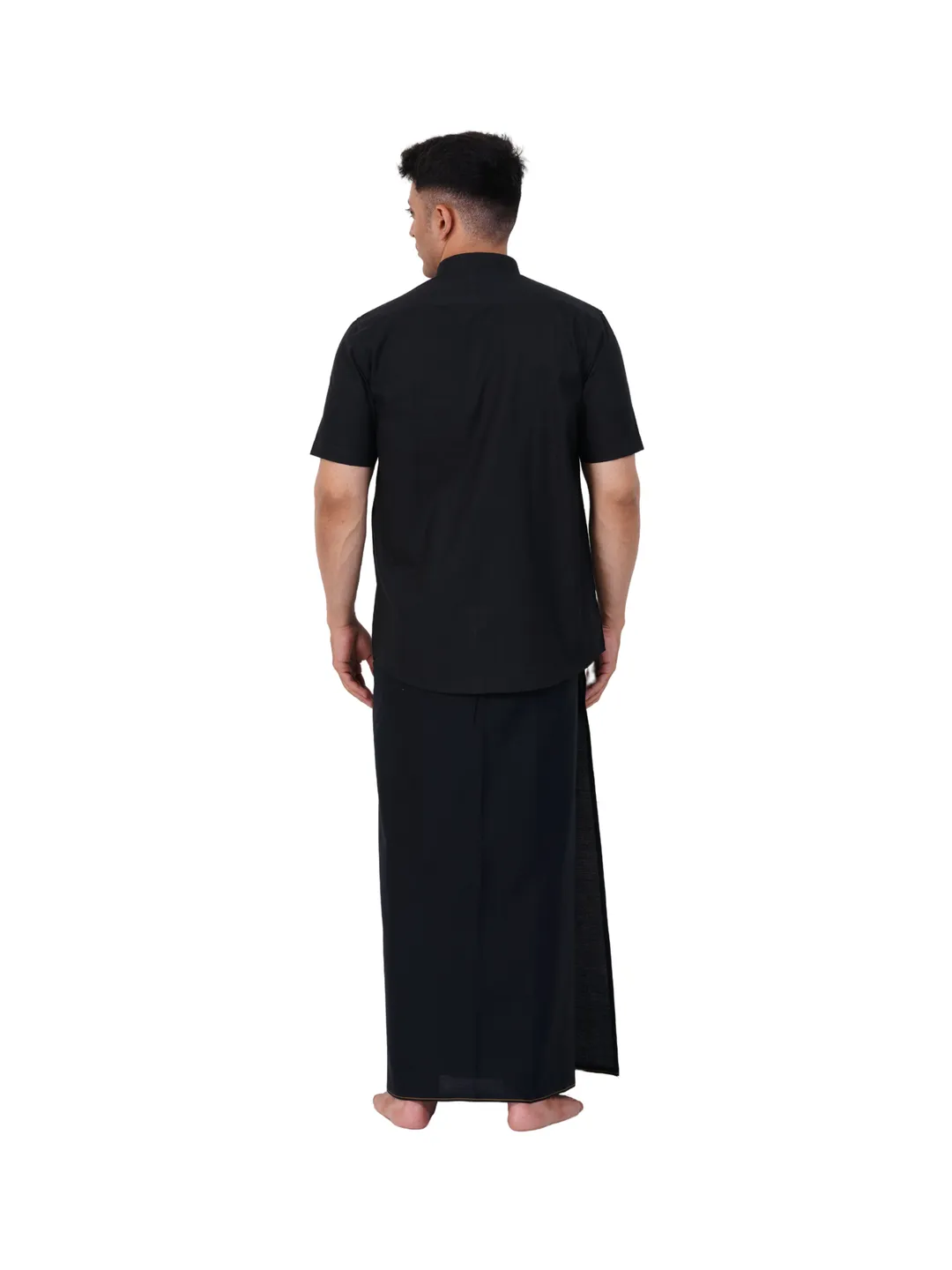 Aiyappa Collections Readymade Half Sleeve Black Colour Shirt(Normal Coller) with Readymade Flexi Size Thin Border Black Dhoti (2 in 1) Set