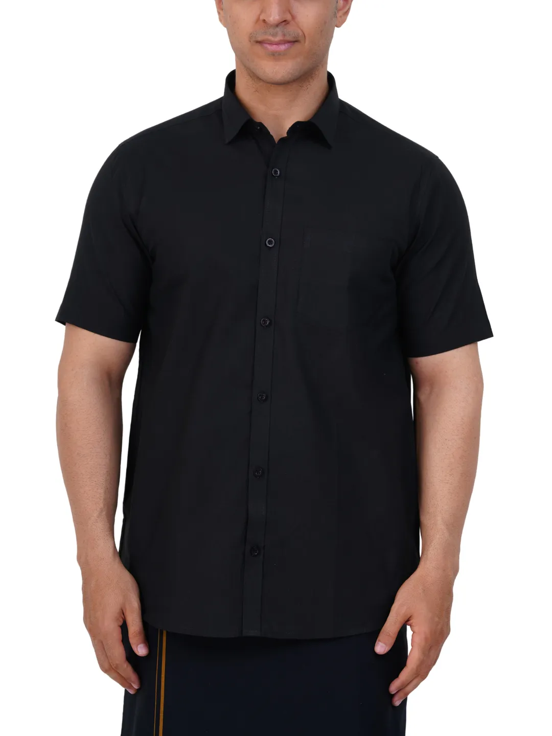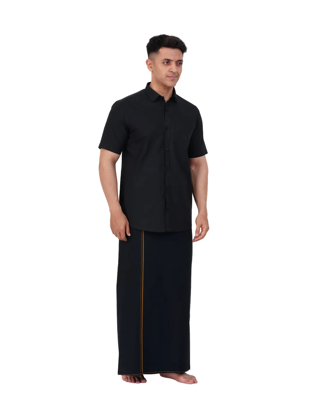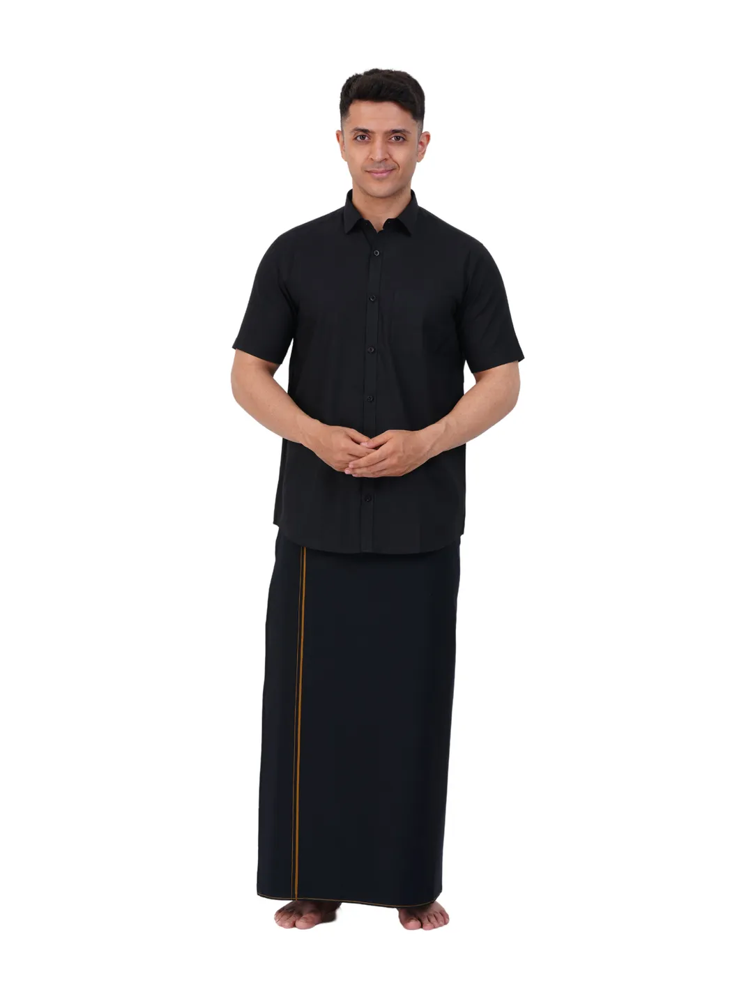 Aiyappa Collections Readymade Half Sleeve Black Colour Shirt(Normal Coller) with Readymade Flexi Size Thin Border Black Dhoti (2 in 1) Set