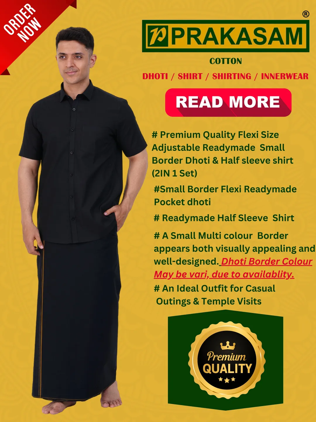 The Prakasam cotton dhoti, featuring a single Roja Small border Flexi Adjustable Readymade Pocket Dhoti, exudes timeless charm and sophistication. When paired with a Ready-made half-sleeve black shirt, this outfit strikes a perfect balance between comfort and style. This set not only represents traditional Indian attire but also embodies elegance and simplicity. Whether for a temple visit, festival, or cultural event, this ensemble is sure to leave a lasting impression with its classic appeal and thoughtful design.