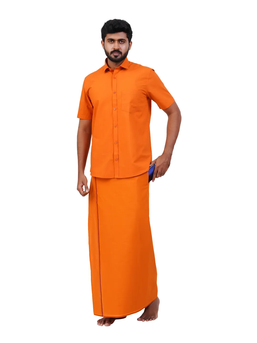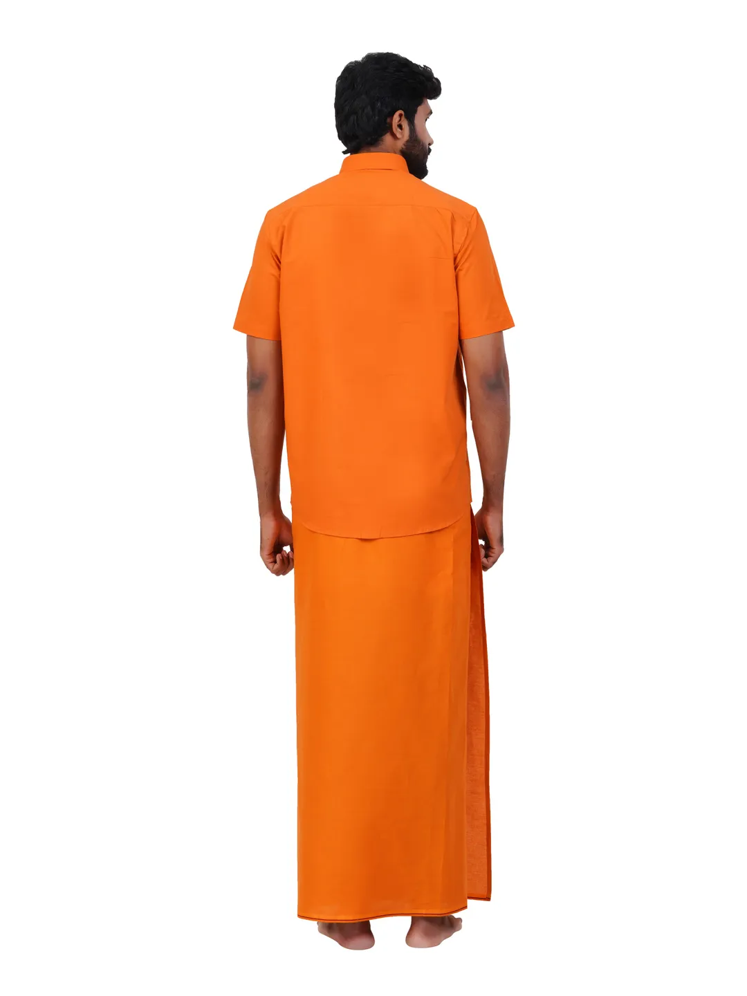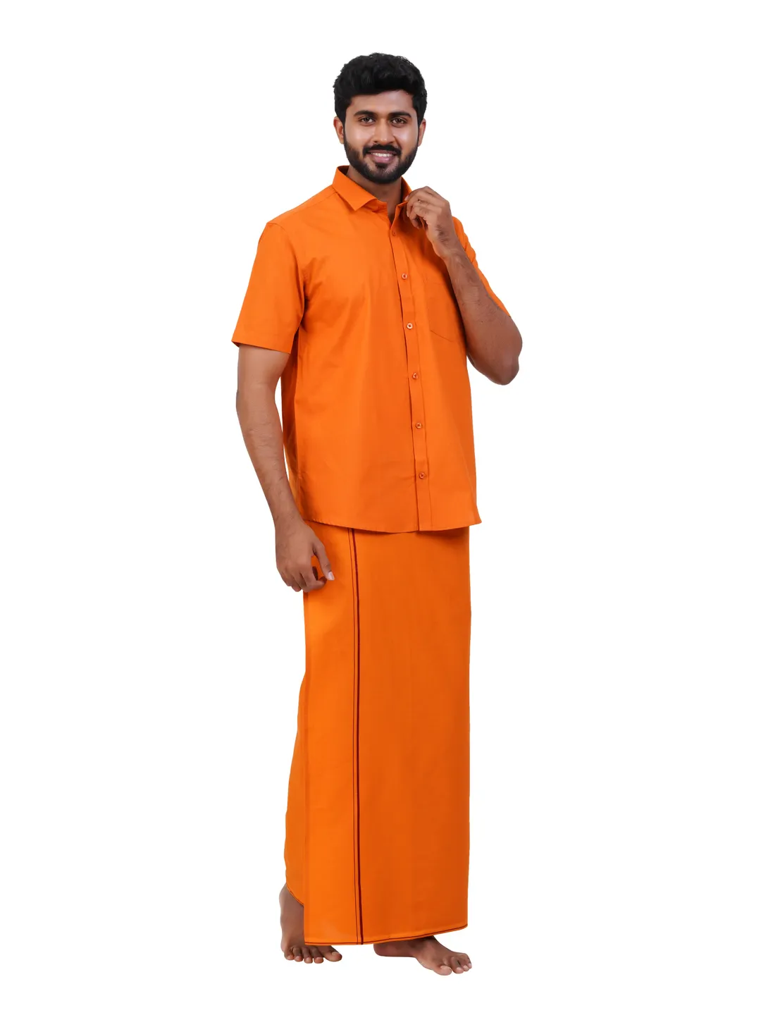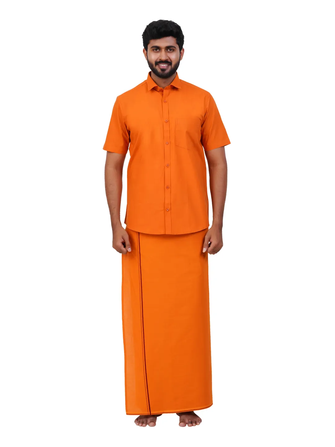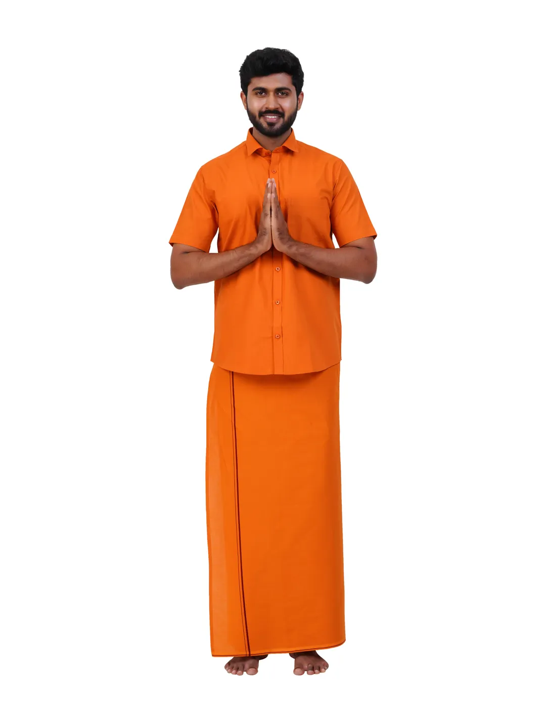 Aiyappa Collections Readymade Half Sleeve Kavi Colour Shirt(Normal Coller) with Readymade Flexi Size Thin Border Kavi Dhoti (2 in 1) Set