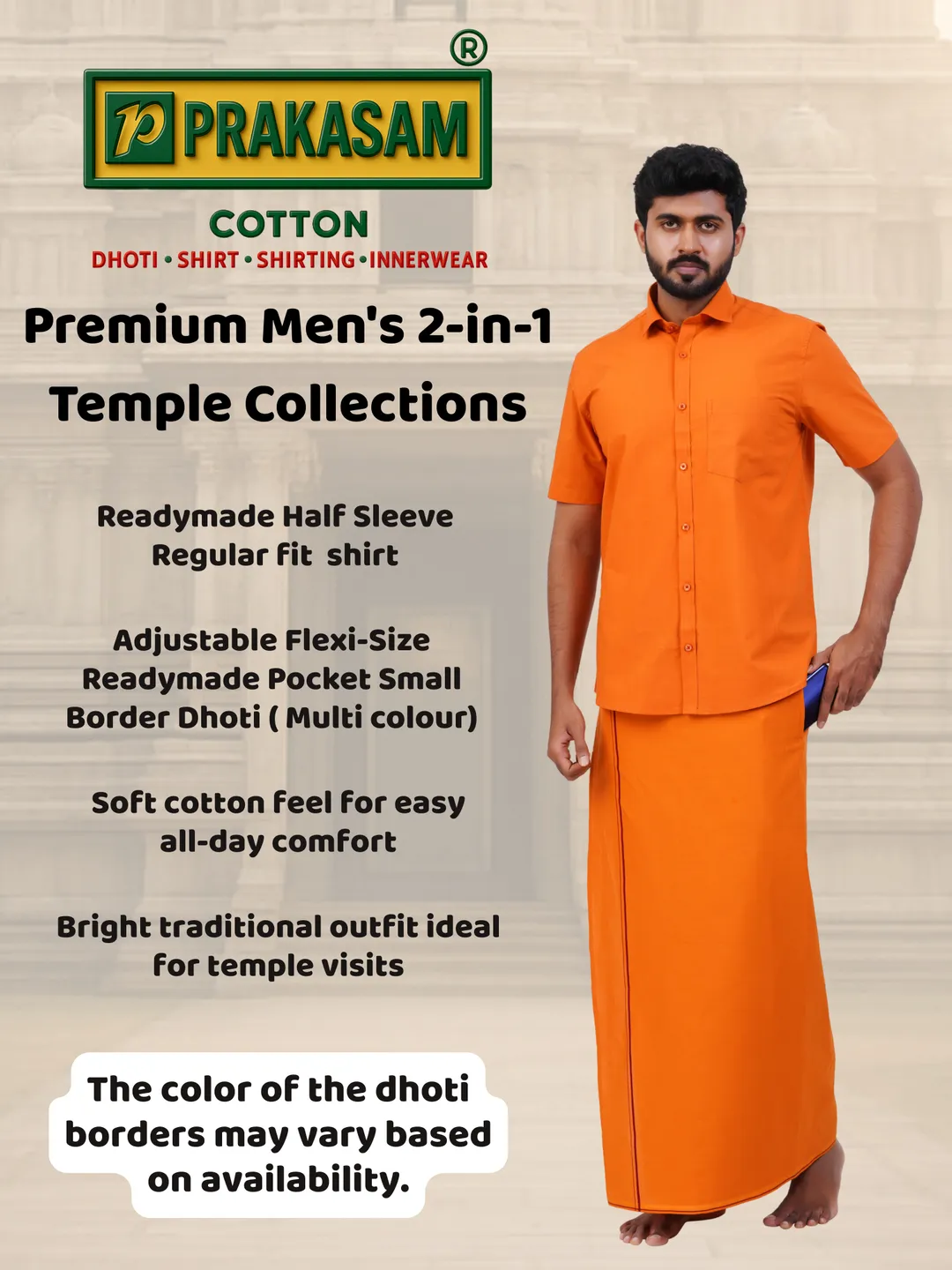 The Prakasam cotton dhoti, featuring a single Roja Small border Flexi Adjustable Readymade Pocket Dhoti, exudes timeless charm and sophistication. When paired with a Ready-made half-sleeve kavi shirt, this outfit strikes a perfect balance between comfort and style. This set not only represents traditional Indian attire but also embodies elegance and simplicity. Whether for a temple visit, festival, or cultural event, this ensemble is sure to leave a lasting impression with its classic appeal and thoughtful design.