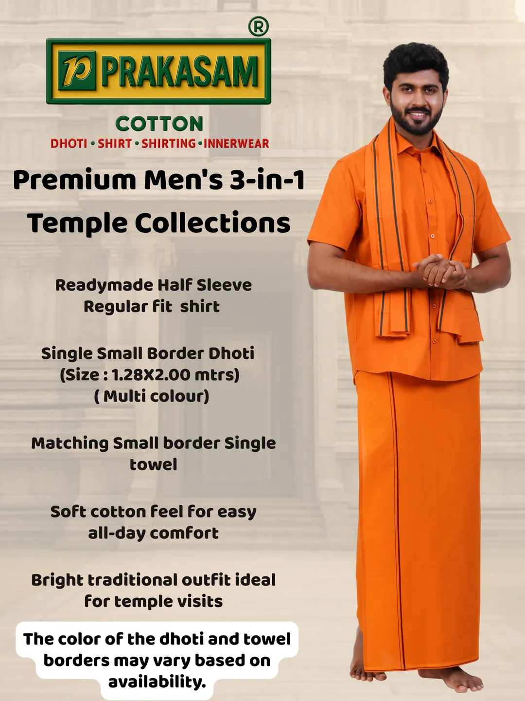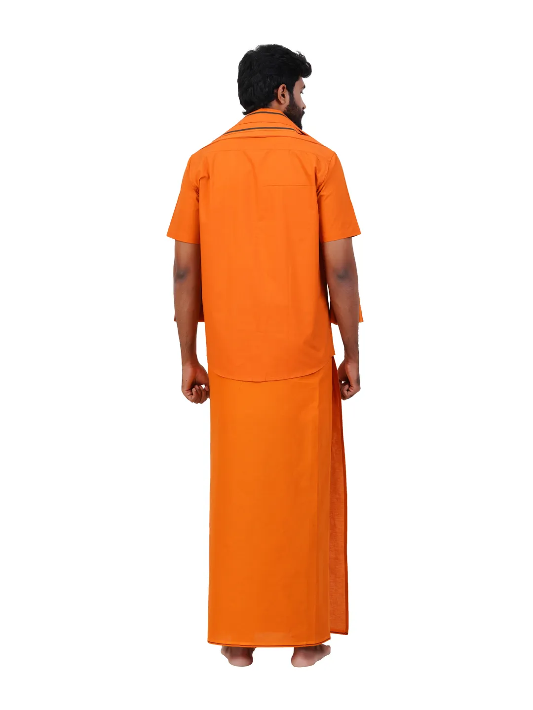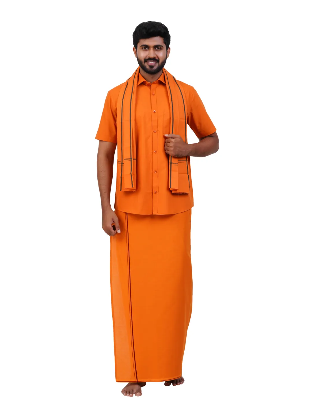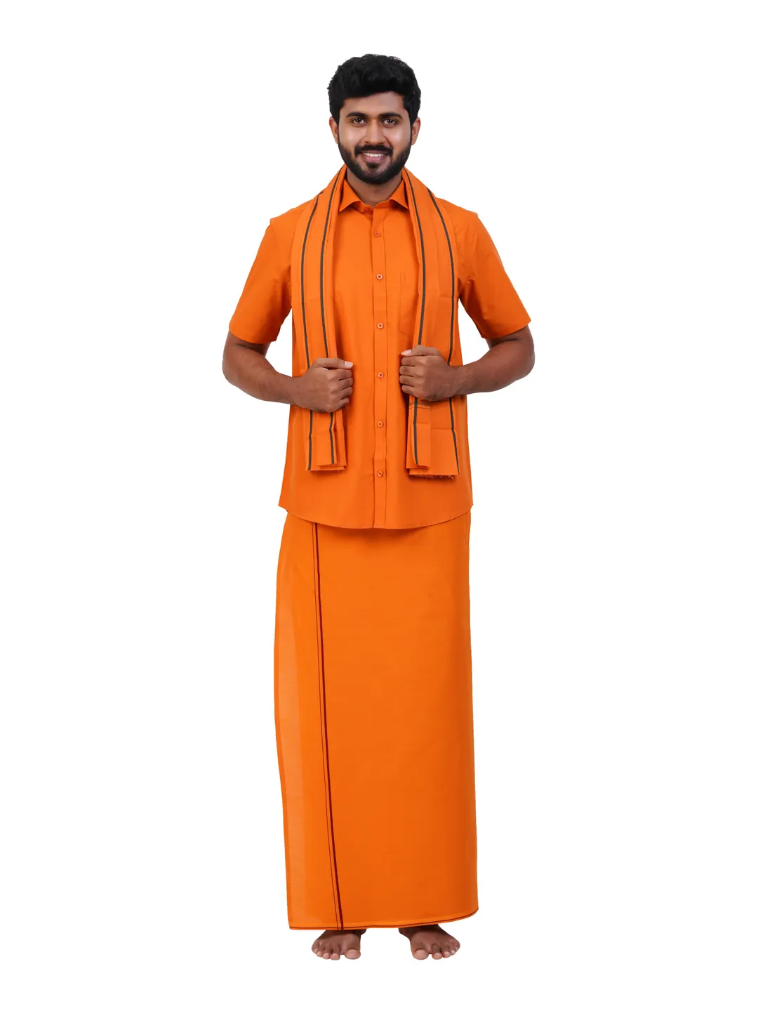 Aiyappa Collections Readymade Half Sleeve Kavi Colour Shirt(Normal Coller) with Single Thin Border ( 1.28x2.00 mtrs) Kavi Dhoti with Matching Towel 3 in 1 Set