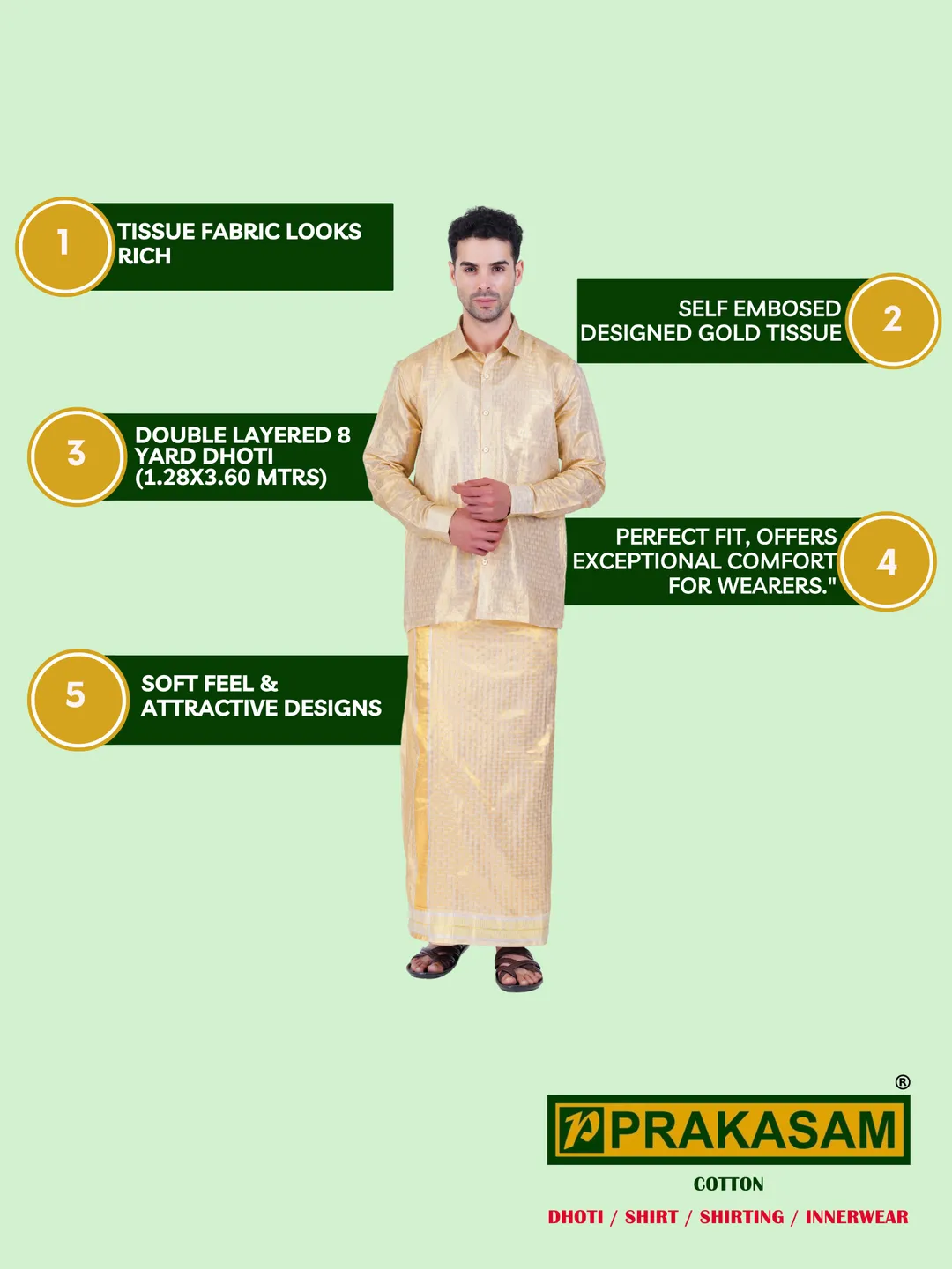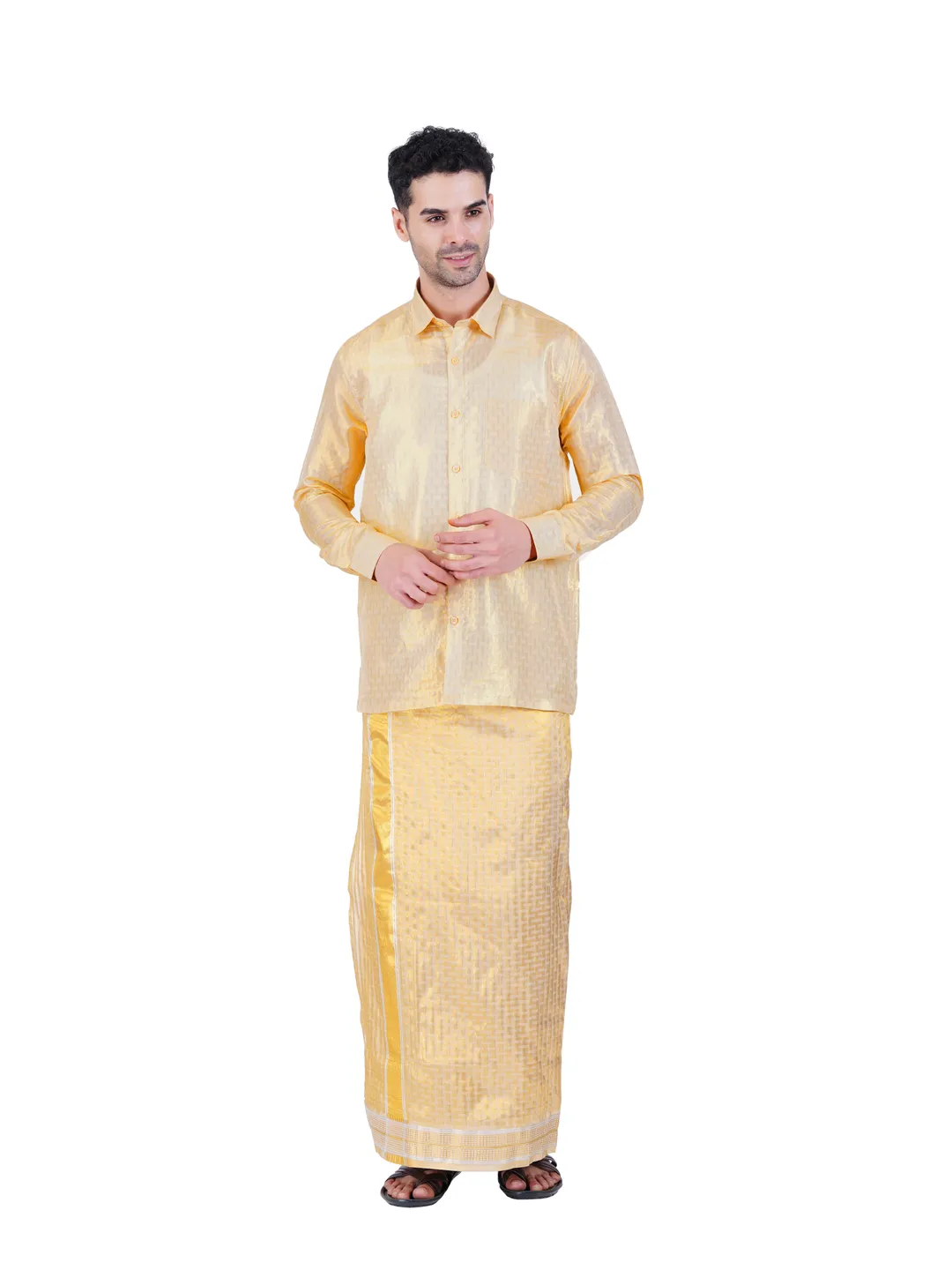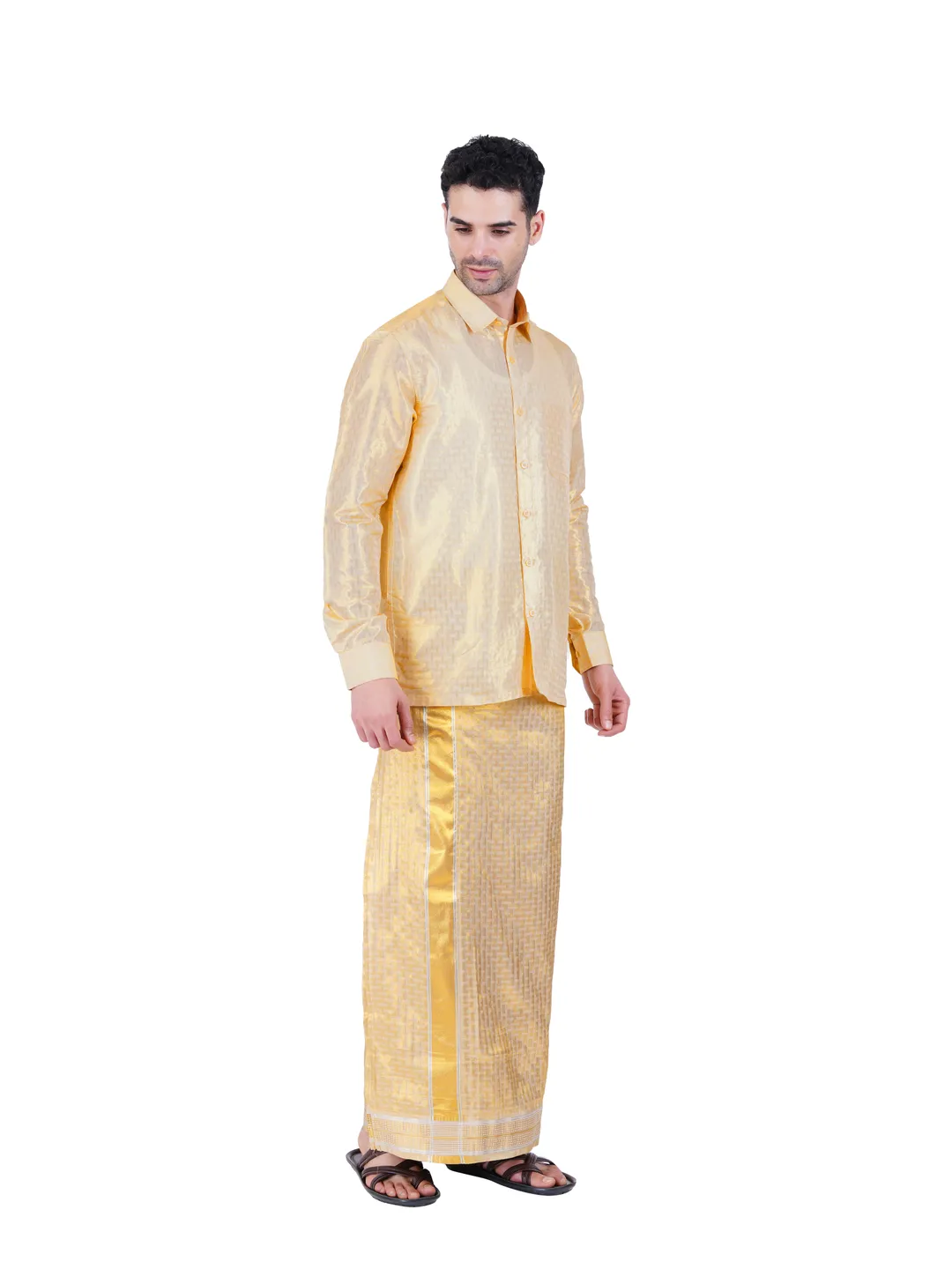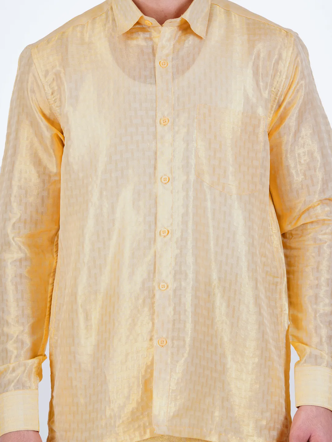 Art Silk 2 In 1 Self embosed Gold Tissue Readymade Full Sleeve Shirt and Dhoti(8 yard)Set