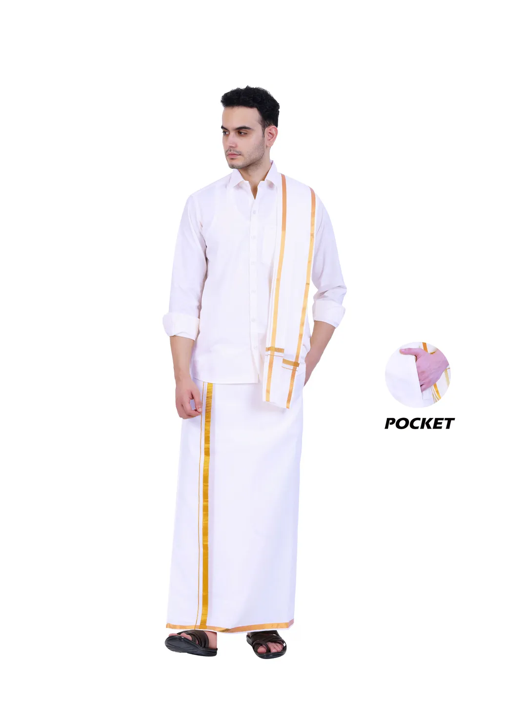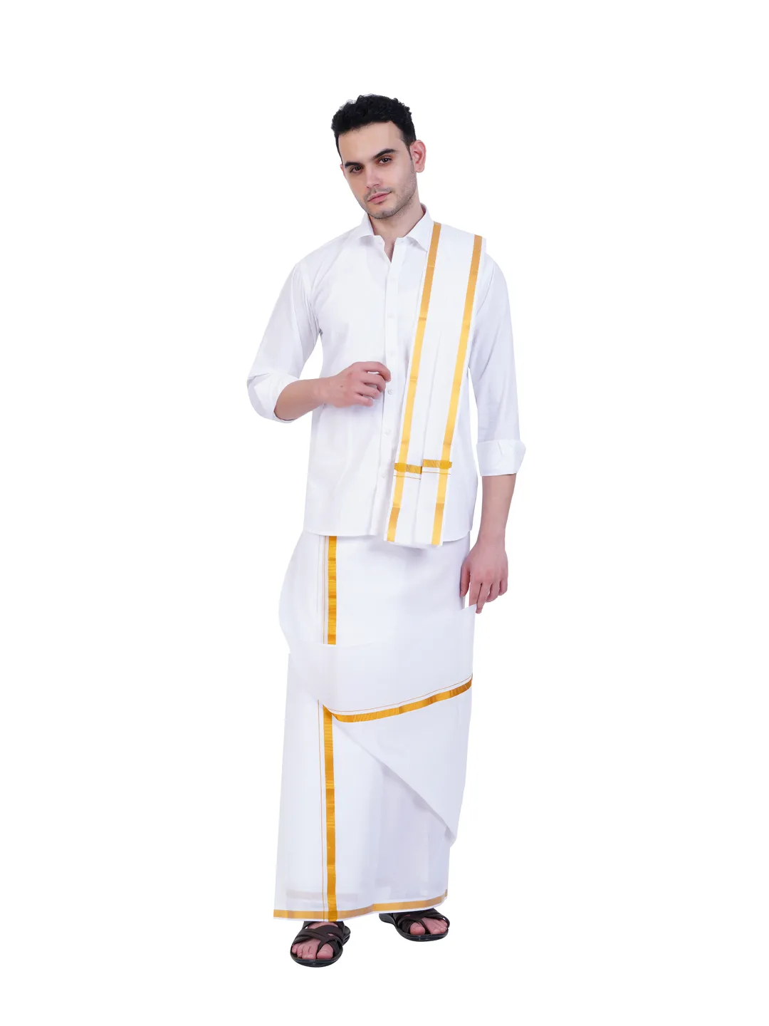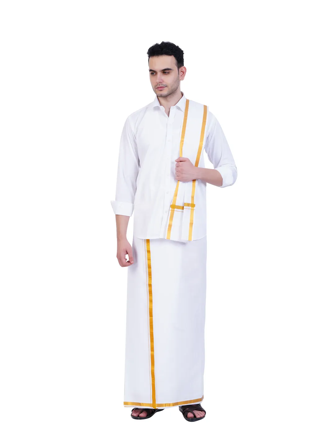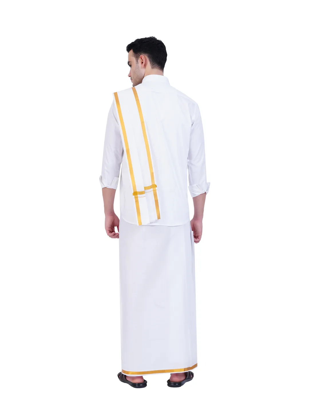 Cotton 3 in 1 Wedding set White Colour (50K) - Readymade full sleeve shirt, Flexi Size Double Dhoti, Angavastram (0.90x1.80 mtrs)
