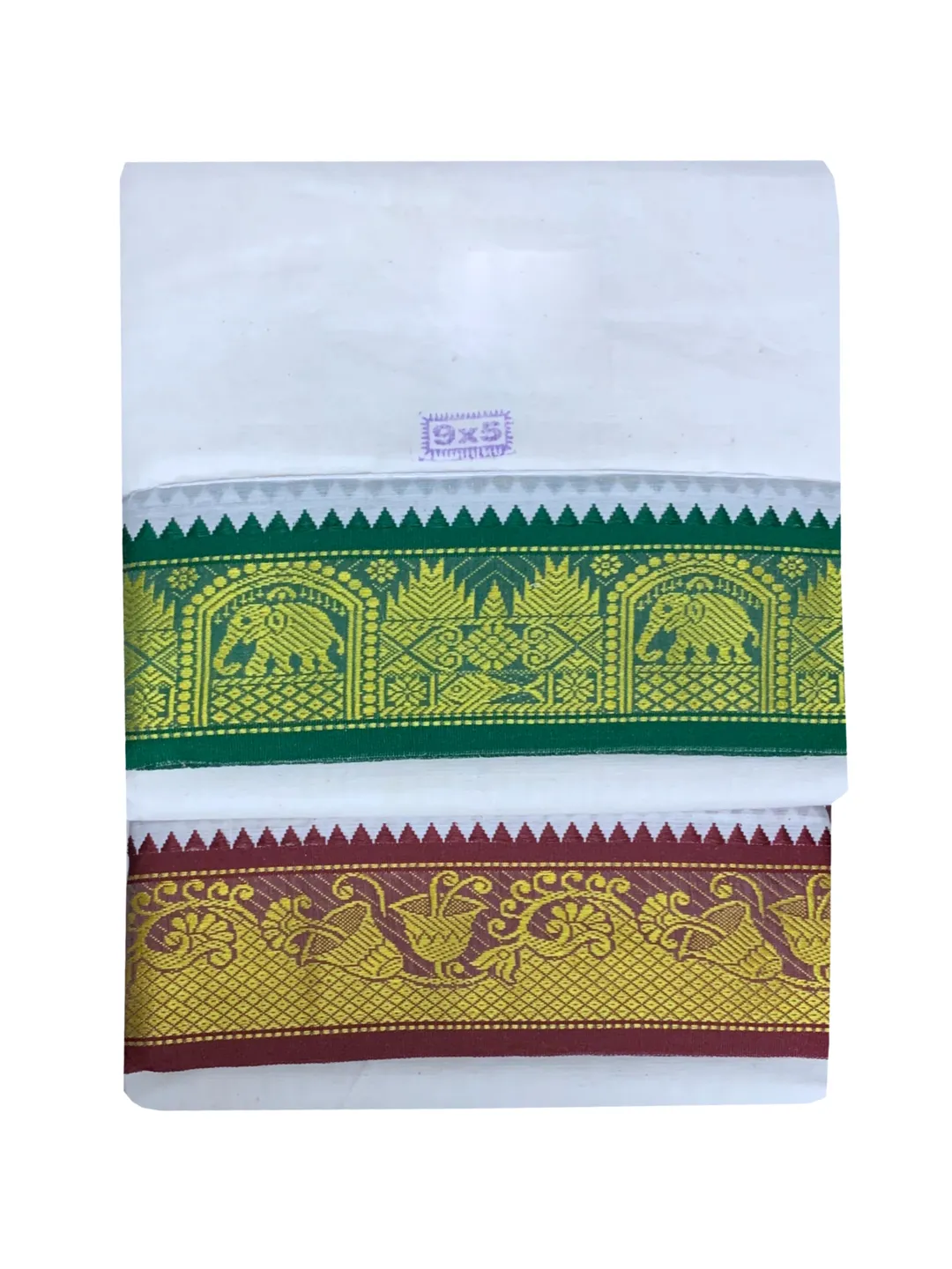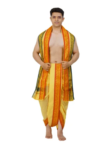 The 9X5 Dhoti Towel Set, also known as the Panchakacham Set, is a meticulously crafted ensemble designed for men. Made from 100% cotton, this set includes a double dhoti measuring 4 meters in length and 1.28 meters in height, along with a single towel measuring 2.25 meters. High-quality threads used in the warp and weft ensure no color bleeding, even after multiple washes. While the border design may vary based on availability, the set offers a wide range of color options. Please note that the continuous material requires separate cutting. This dhoti towel set combines quality and durability, making it an ideal choice for traditional wear.