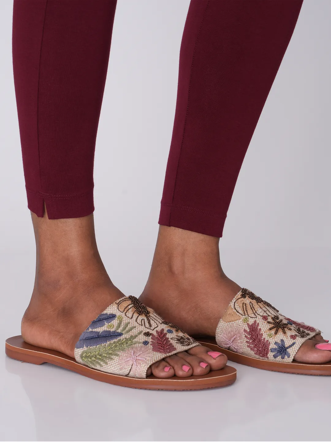 Featuring a 3-inch elastic waistband, these leggings provide a secure and flattering fit that effortlessly complements your figure. The inclusion of an invisible zipper pocket adds a practical touch, ensuring that your essentials are always close at hand. Crafted from a high-quality cotton spandex fabric, these leggings offer unrivalled stretch and breathability, allowing you to move freely throughout your day. Additionally, the unique slit in the ankle not only adds a fashionable element but also promotes healthy blood circulation, keeping you feeling invigorated and energized. Available in Beige, Black, Green, Maroon, Navy Blue and White Colors.