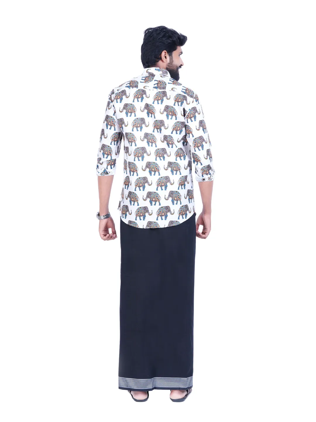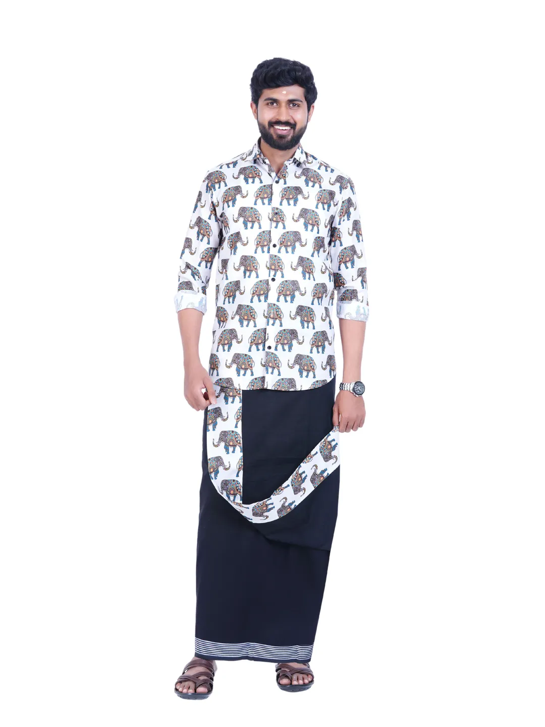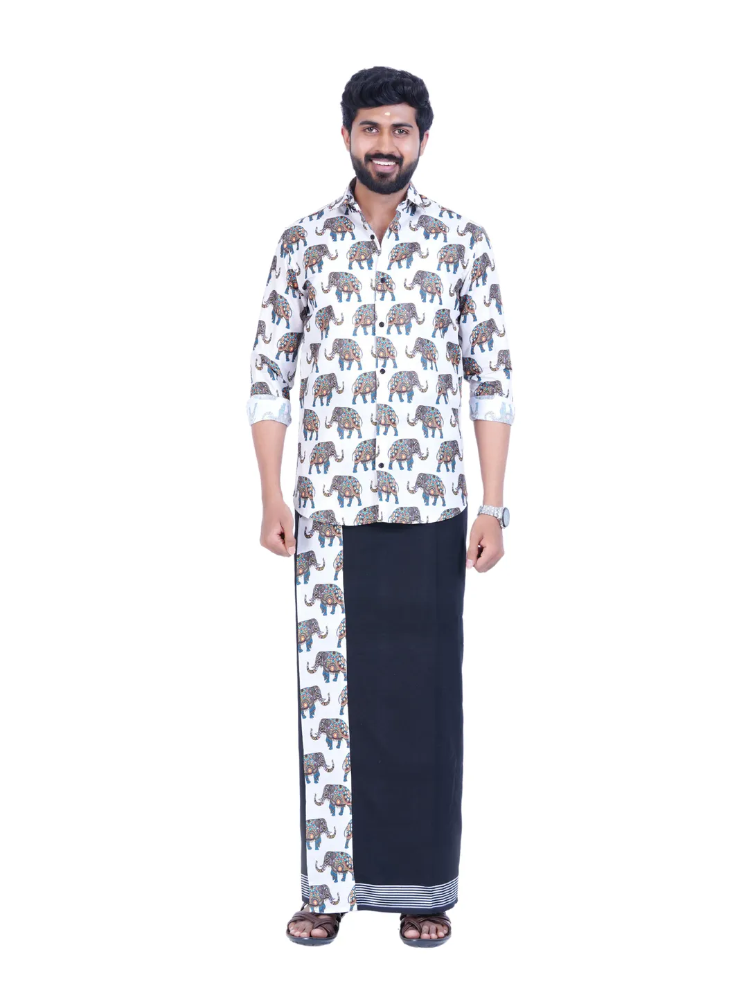 Onam Set Readymade Elephant Printed Full Sleeve Shirt with Matching Printed Border Black Dhoti