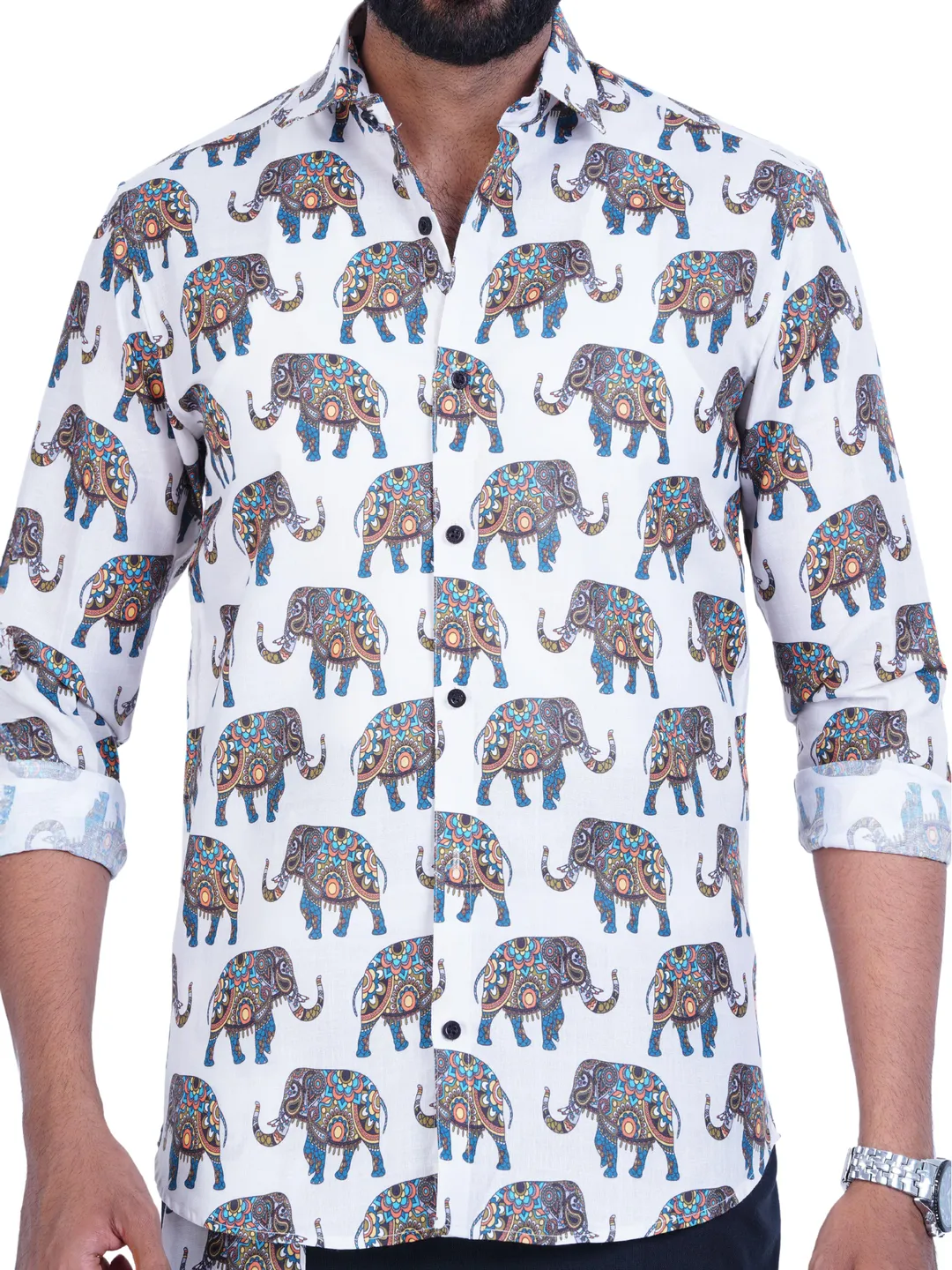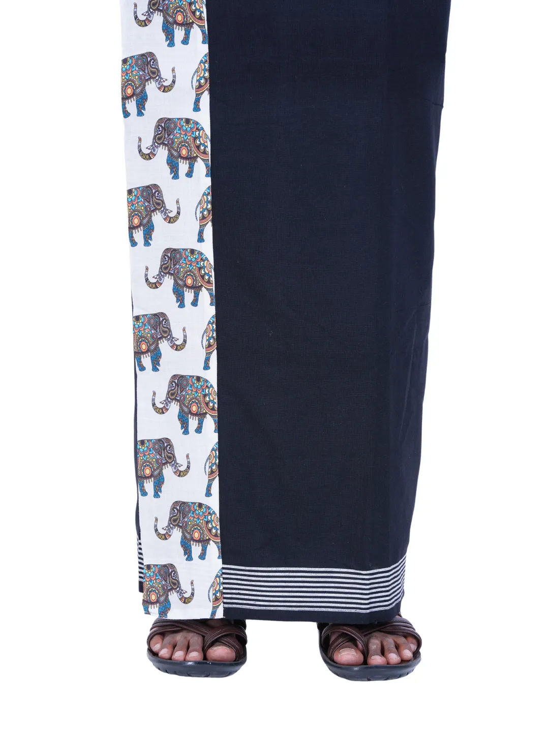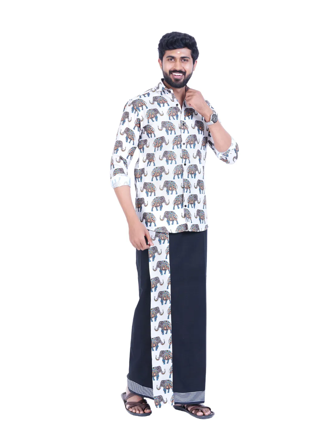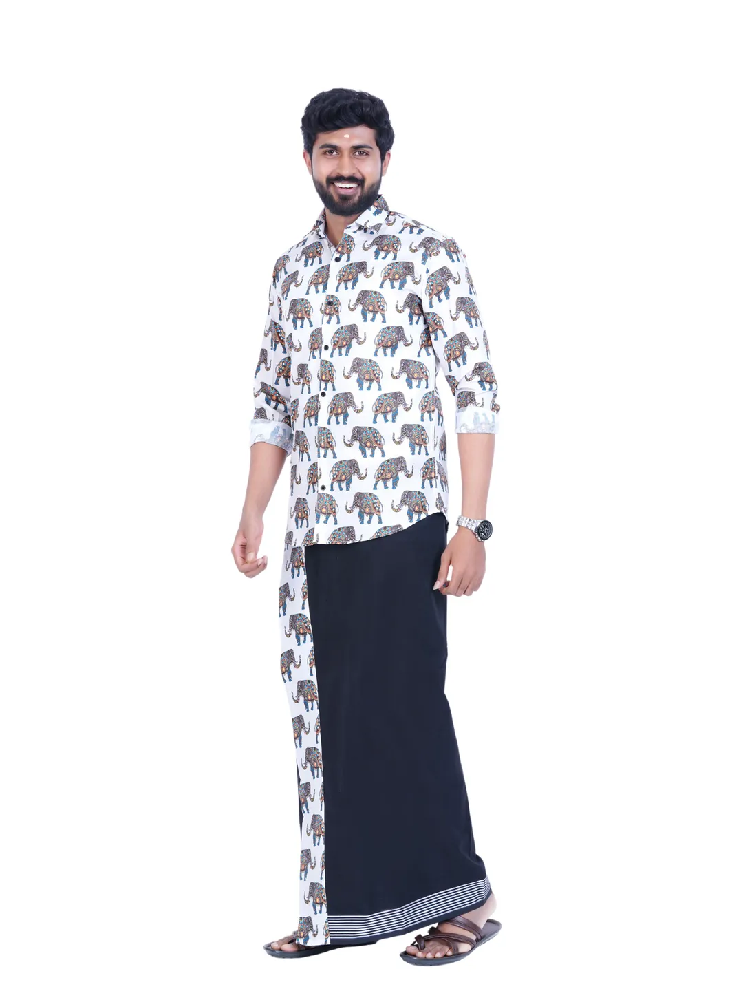 Onam Set Readymade Elephant Printed Full Sleeve Shirt with Matching Printed Border Black Dhoti