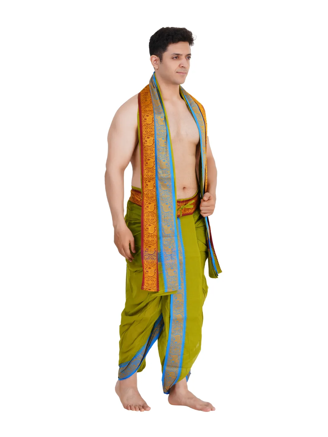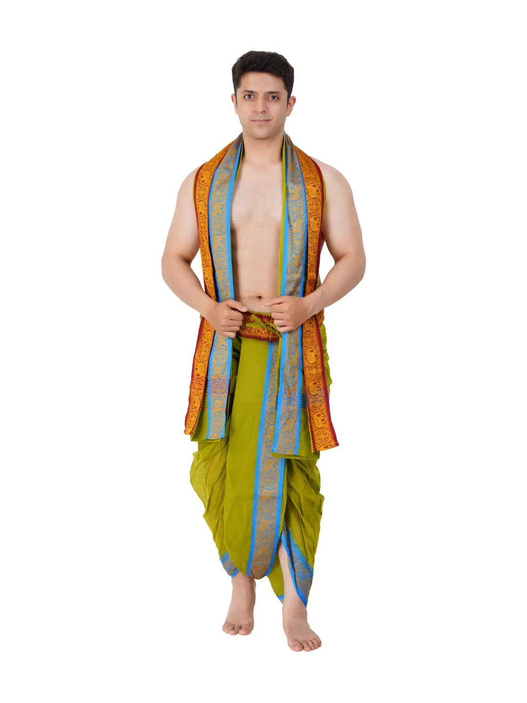 Ready To Wear (readymade) Cotton Mild Green Colour Panchakacham with Towel Set (3 inch)