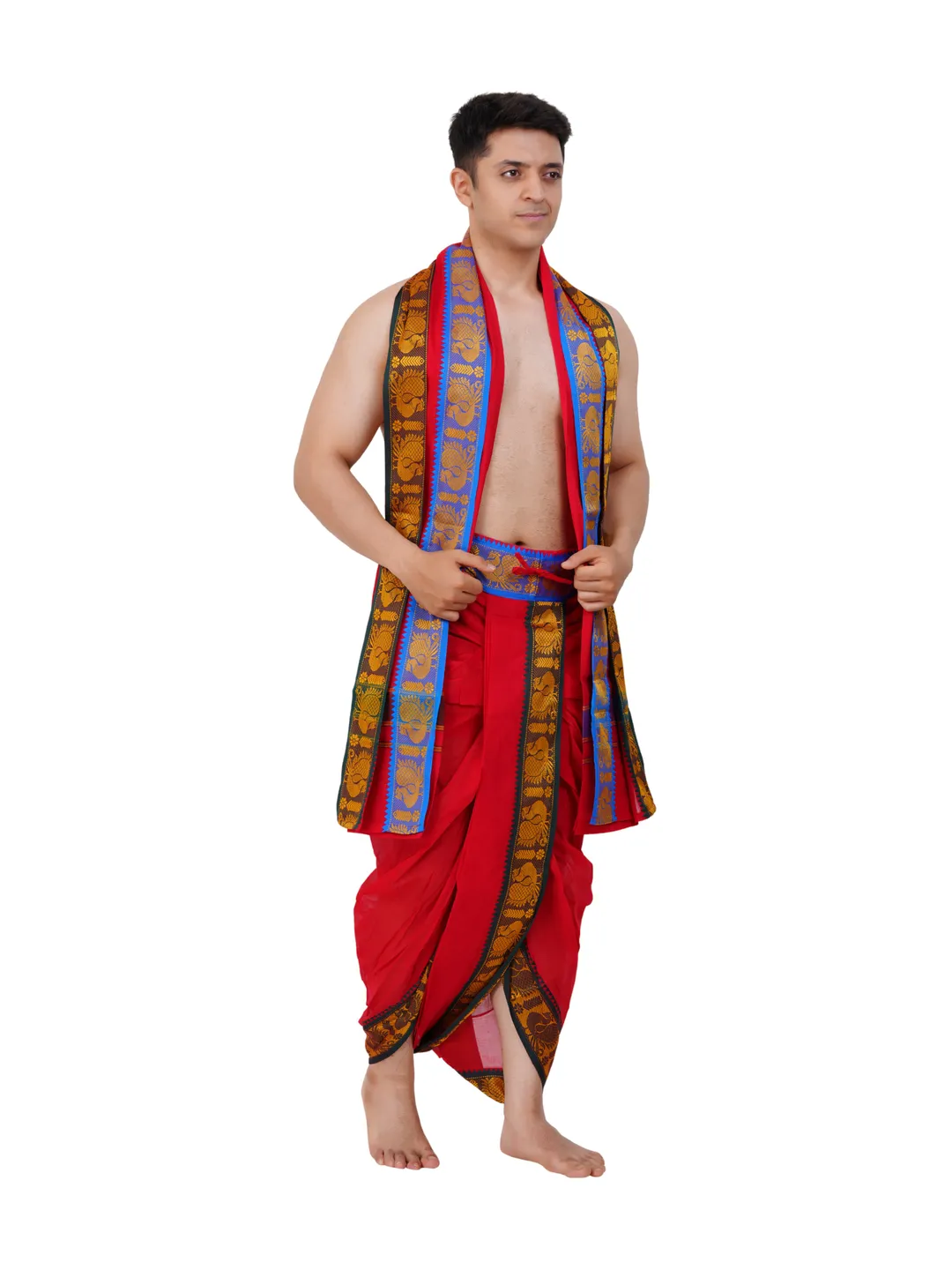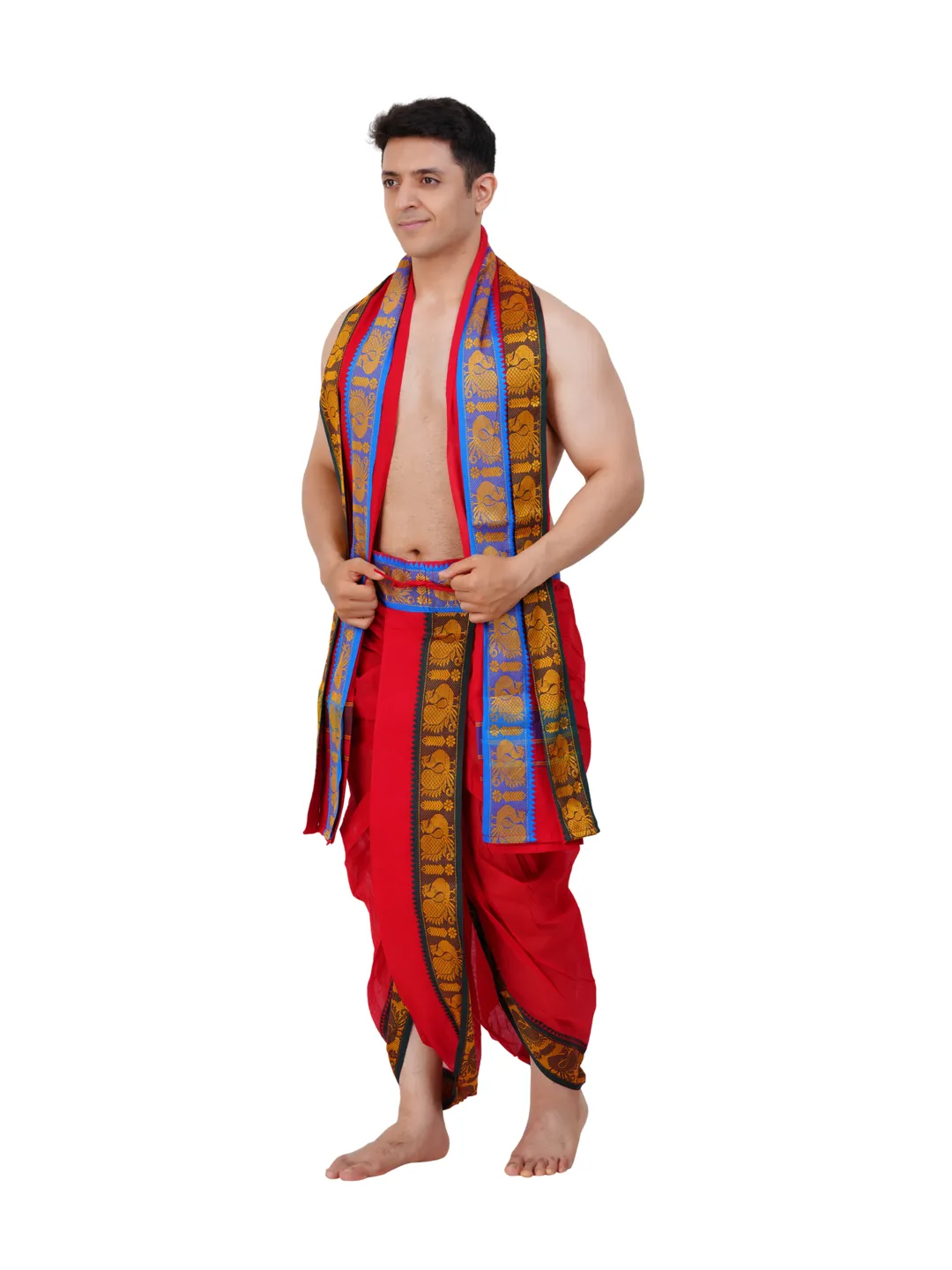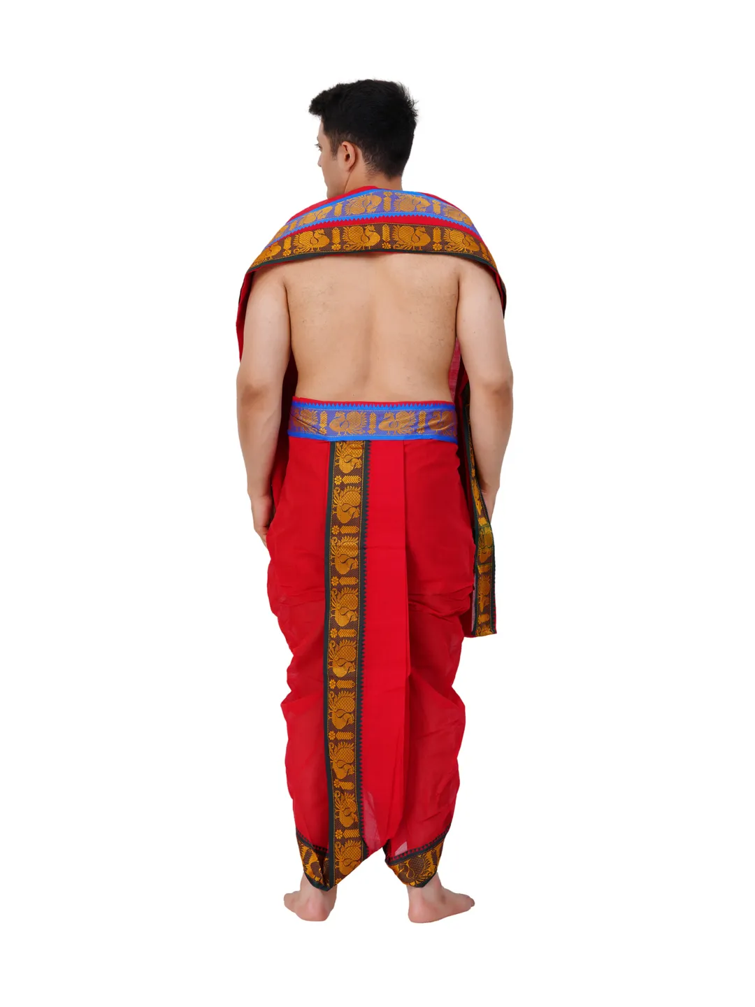 Ready To Wear (readymade) Cotton Red Colour Panchakacham with Towel Set (3 inch)