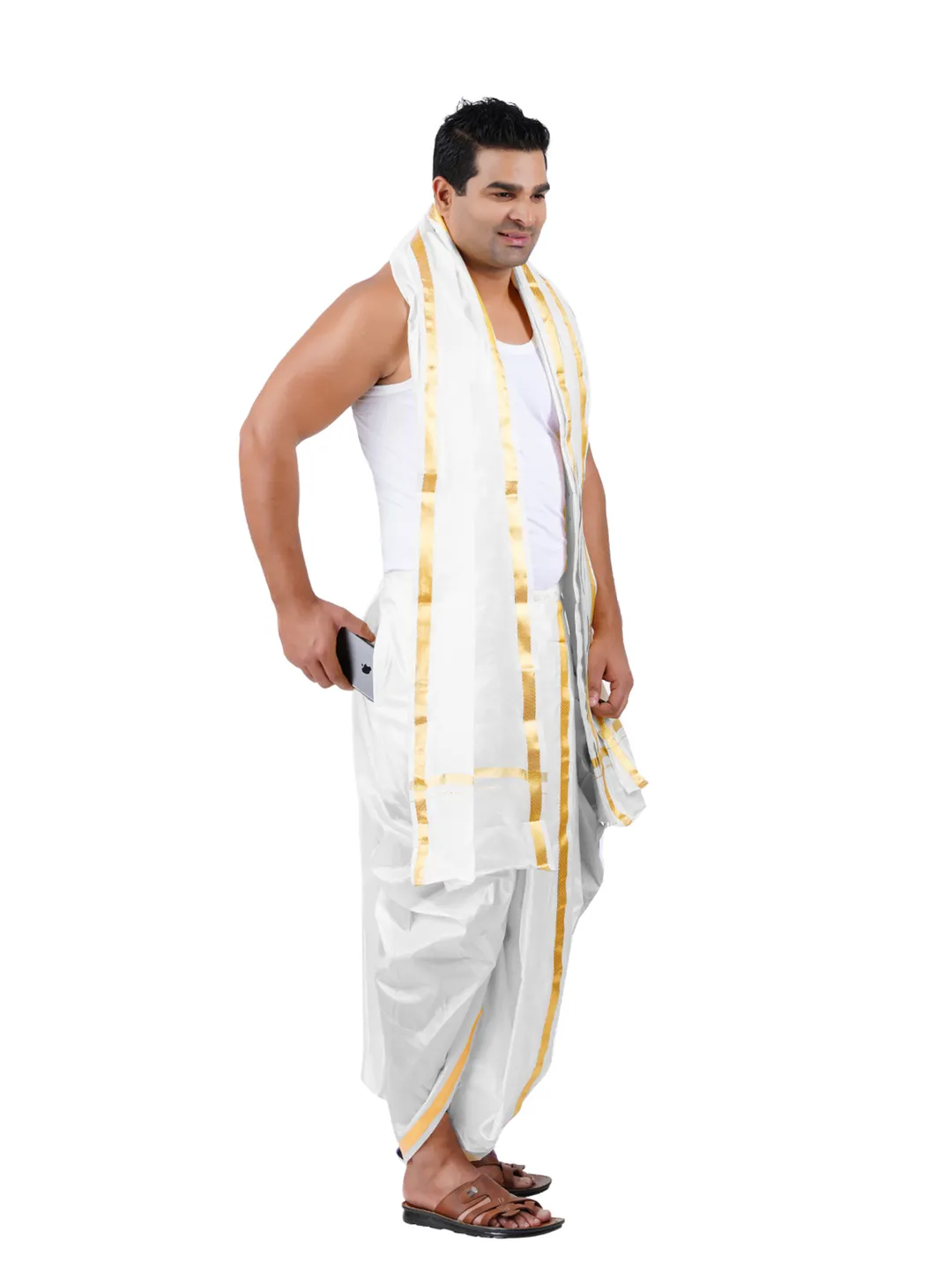 Ready To Wear (Readymade) Puremix 9x5 White Colour Panchakacham With Towel Set (Jari - 50k)