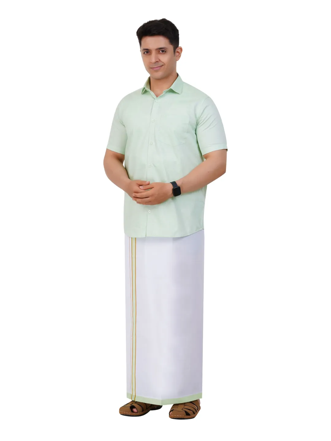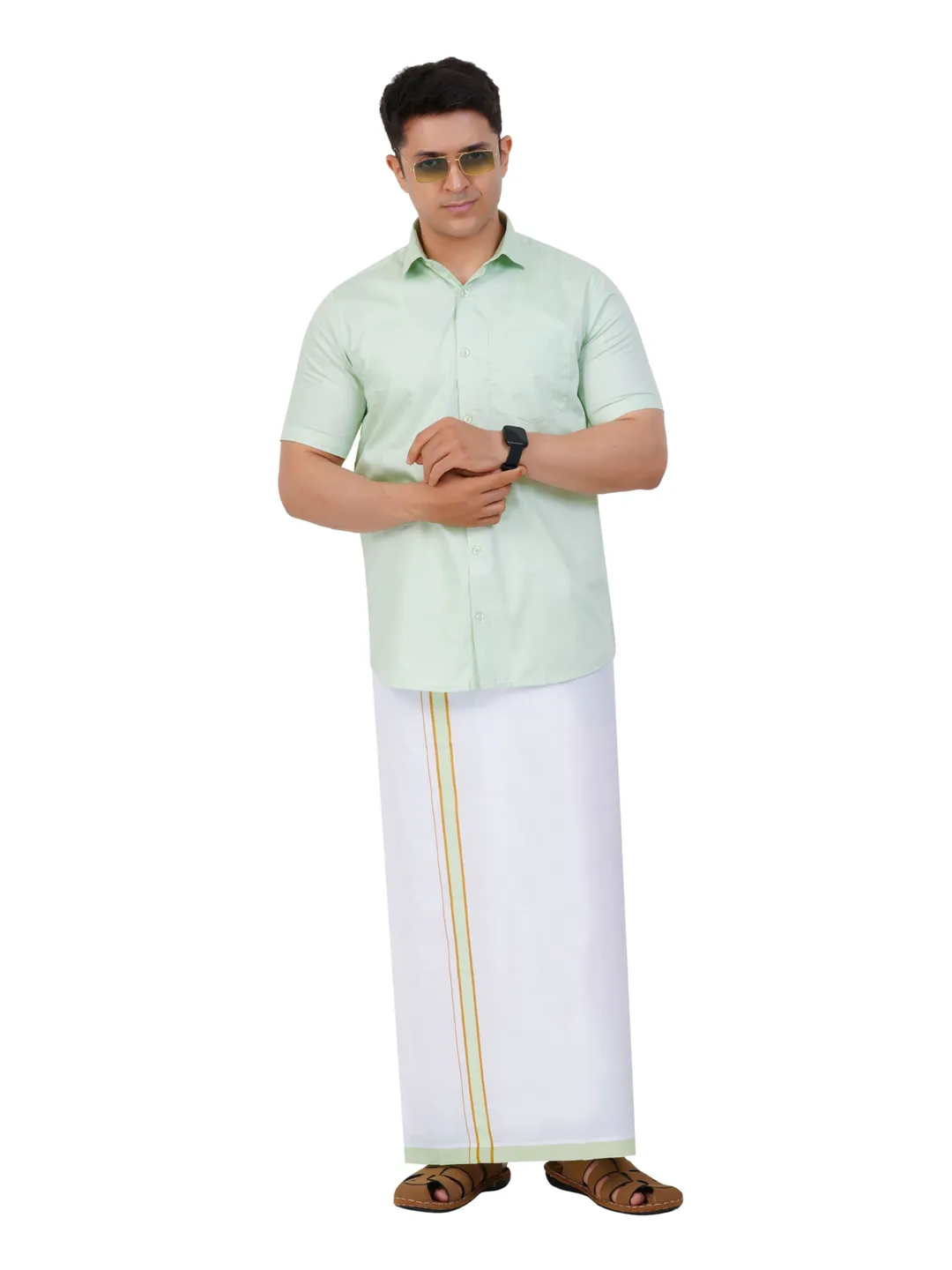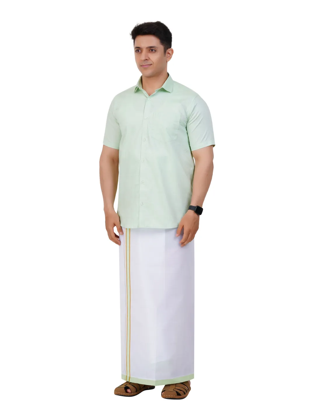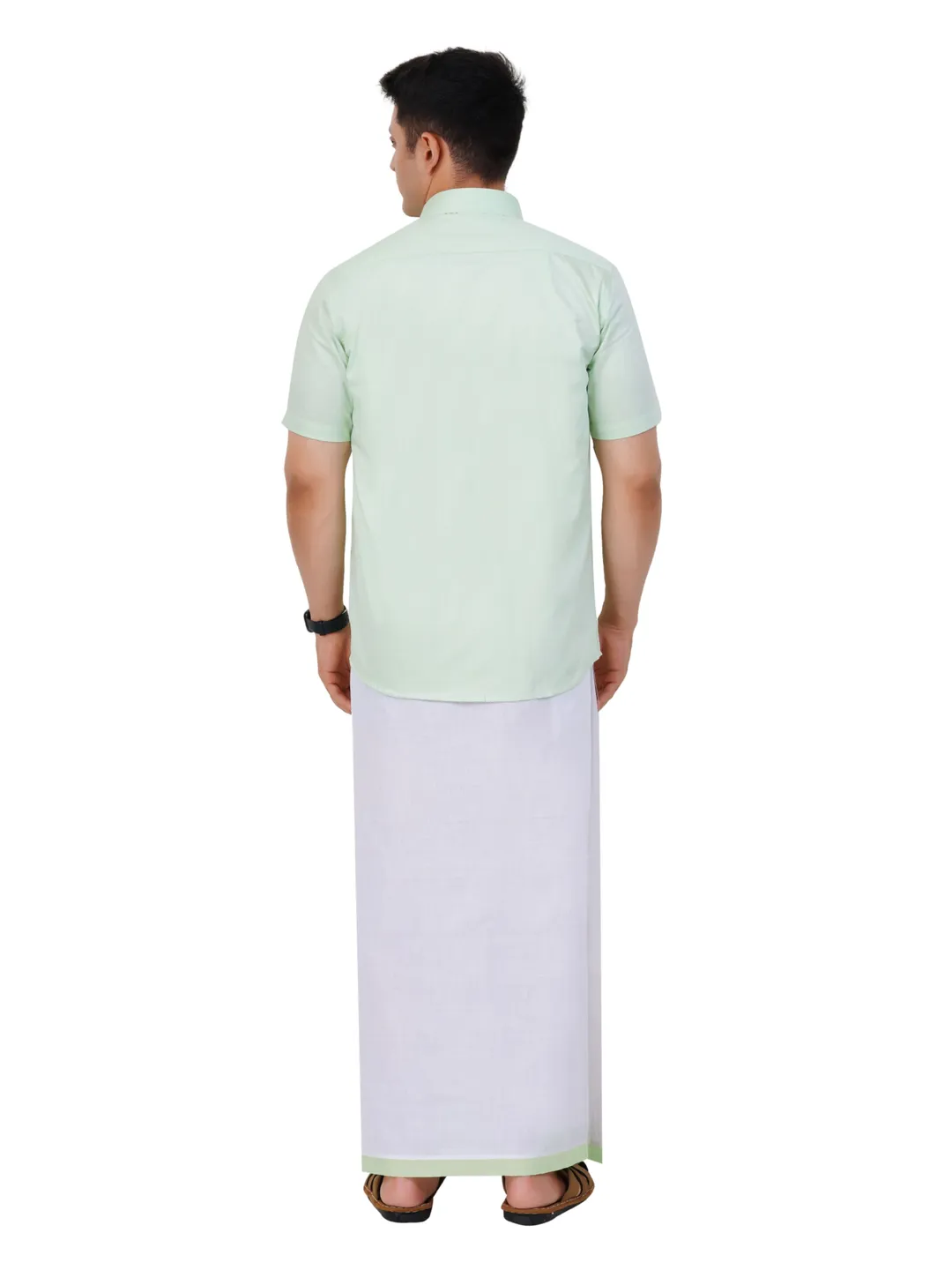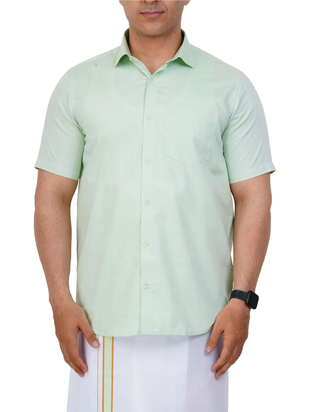 Readymade Half Sleeve Pista Green Colour Shirt and Matching Border Dhoti Set