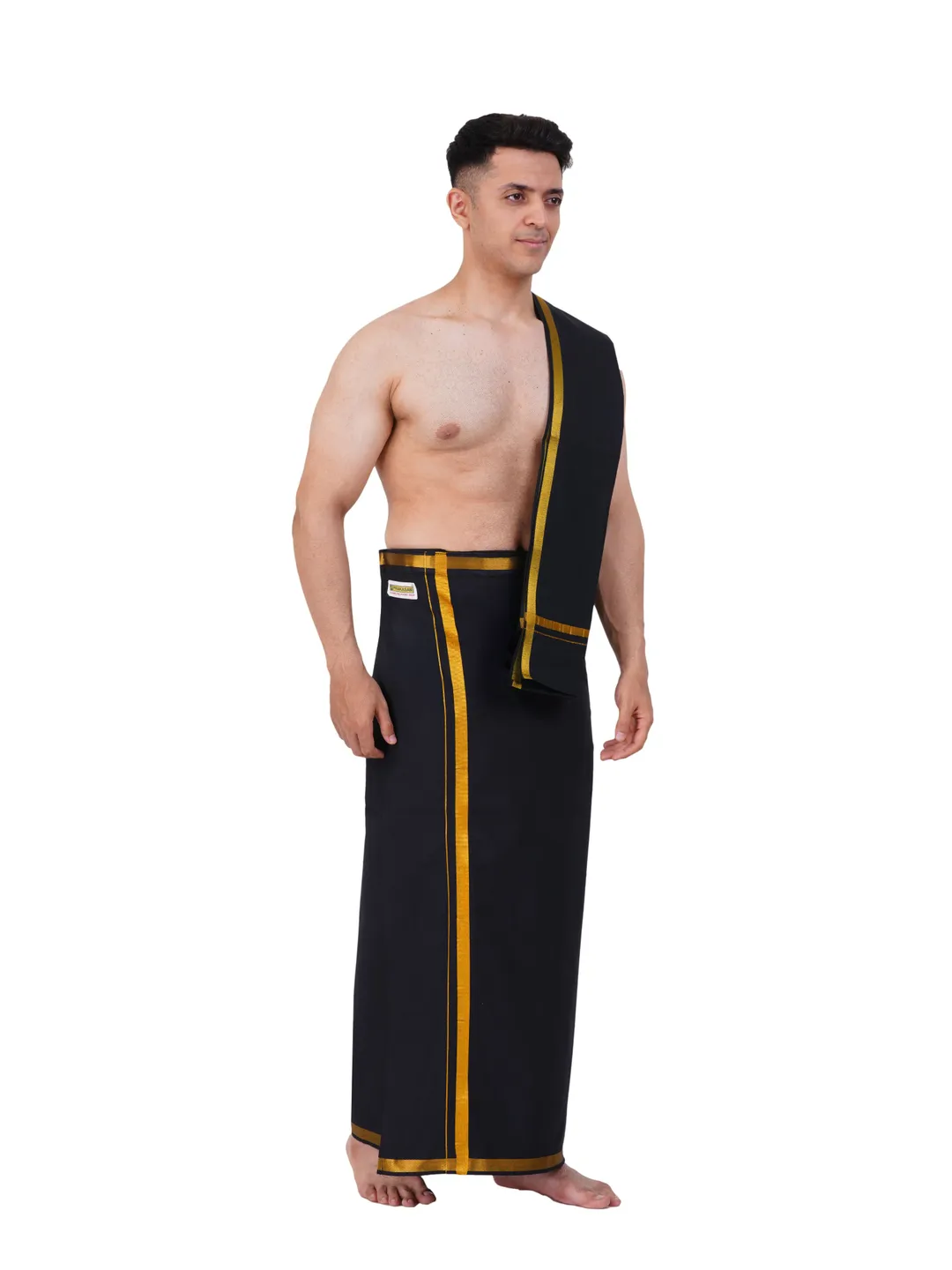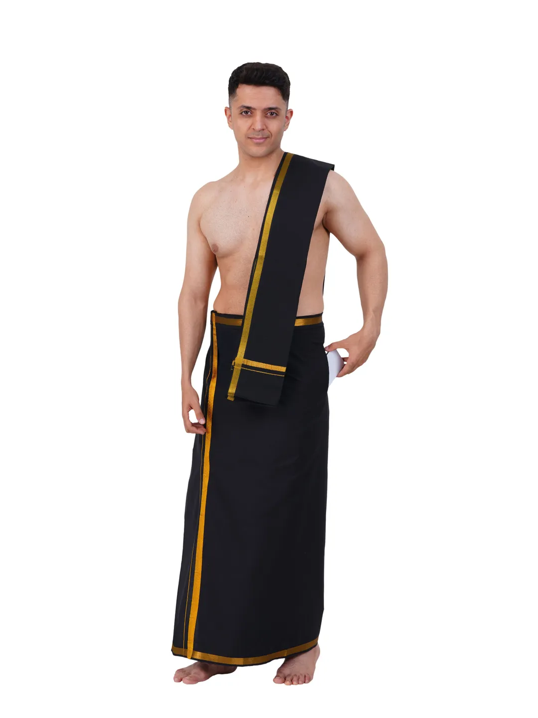 We are offering Premium Quality Cotton black Dhoti with an adjustable Velcro pocket and matching Golden Jari Border Angavastram. Ideal for casual and temple wear, our soft, high-quality cotton ensures a rich look. Once you try our dhoti, you'll prefer it over other brands. The adjustable design fits all sizes, with a single cross pocket on the right side and a stylish left border. Available in sizes S (hip size 26-34 inches), M (36-40 inches), and L (40-46 inches), our unique pocket placement is a trendsetter in cross-pocket dhotis, designed for long-lasting use.