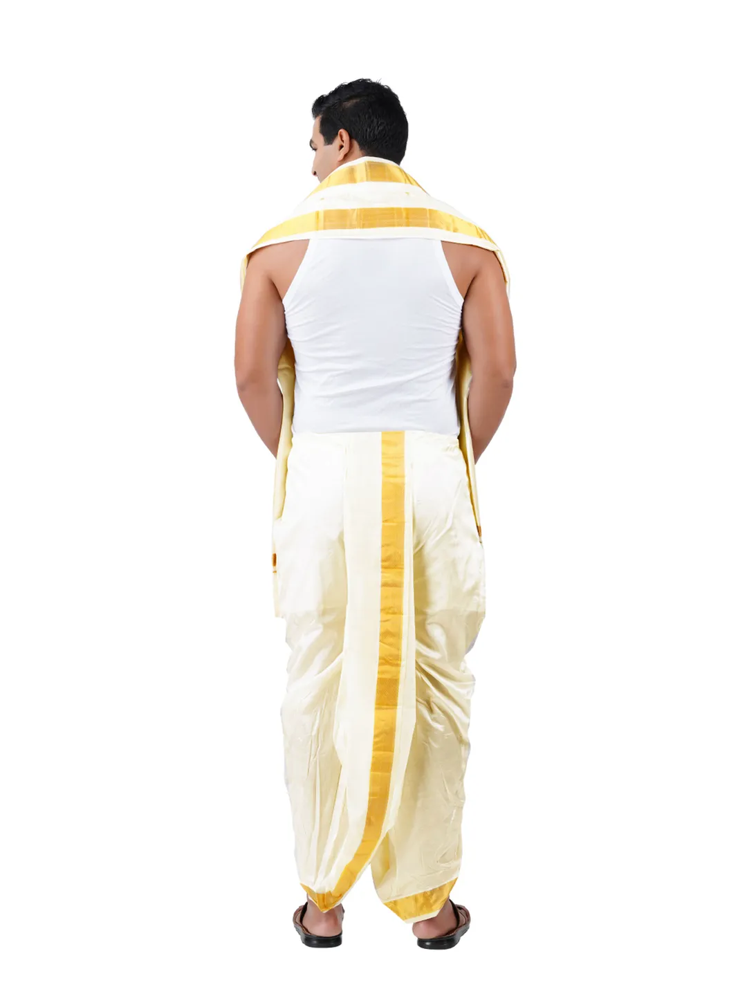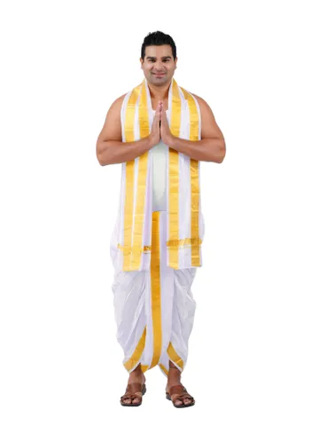 Do not brush or lash the silk dhotie it might lead to tearing the zari