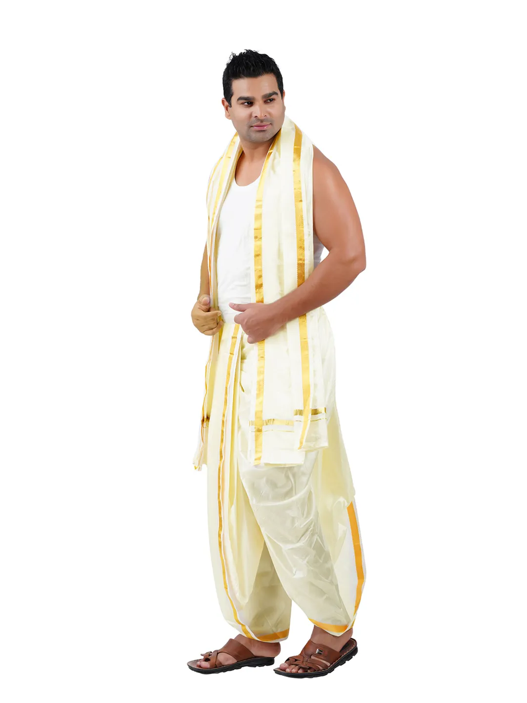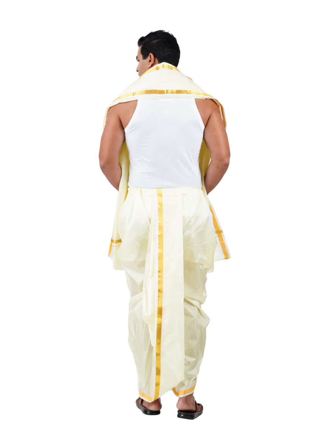 Do not brush or lash the silk dhotie it might lead to tearing the zari