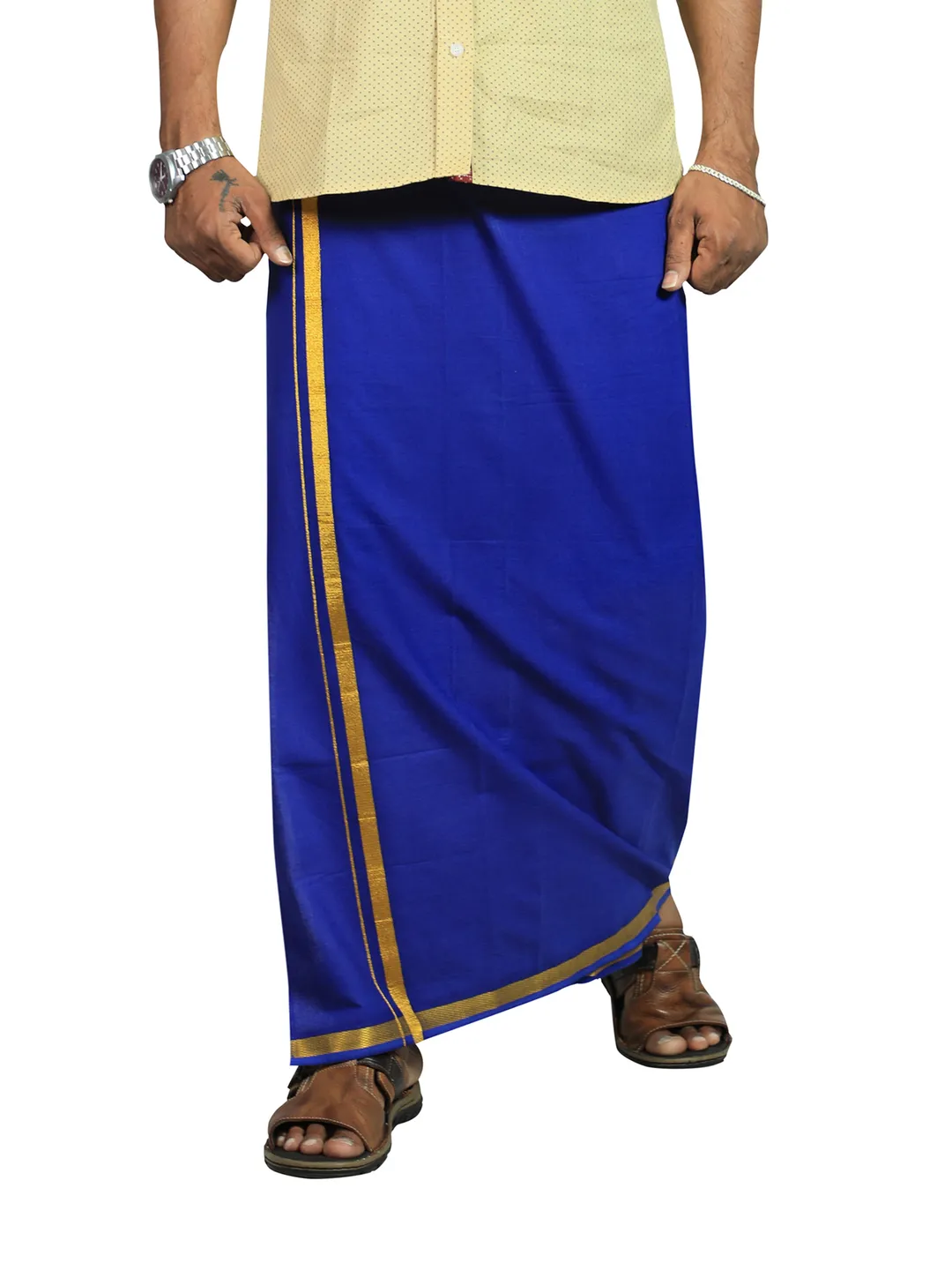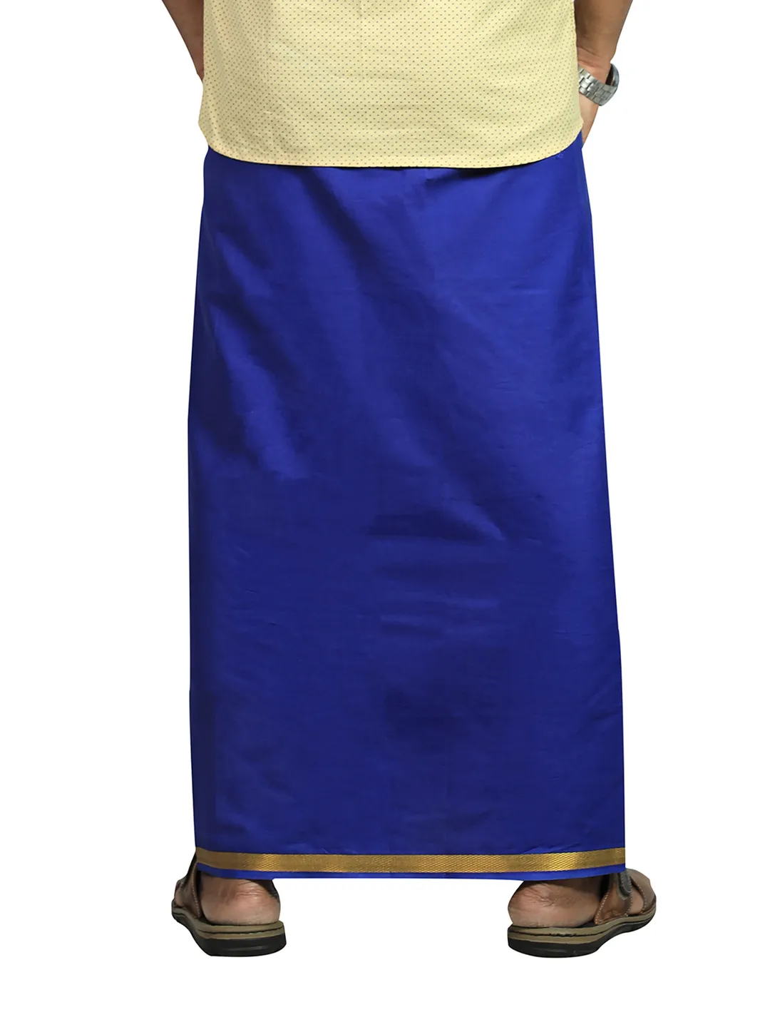 This Products are Purely Cotton fabric. The border size is 1 inch Gold Jari Border and it's looking very good. It's best suitable for temple and casual wear. The extra fabric from hip to knee, can wear this dhoti without any shyness. A Single pocket is on the right side for mobile and wallets, etc.., Its a free size So easily wear All peoples Hip size 26 up to 46.