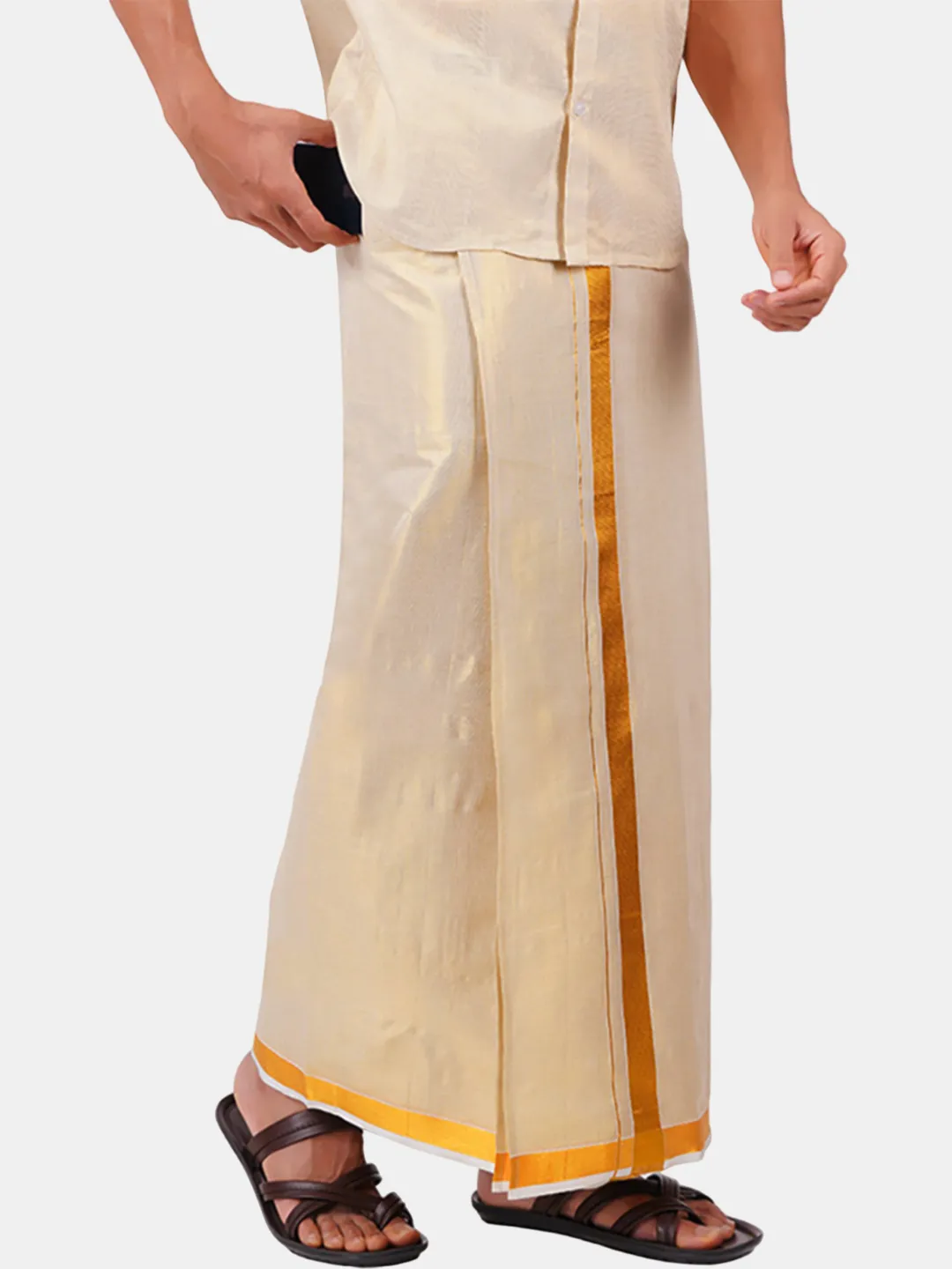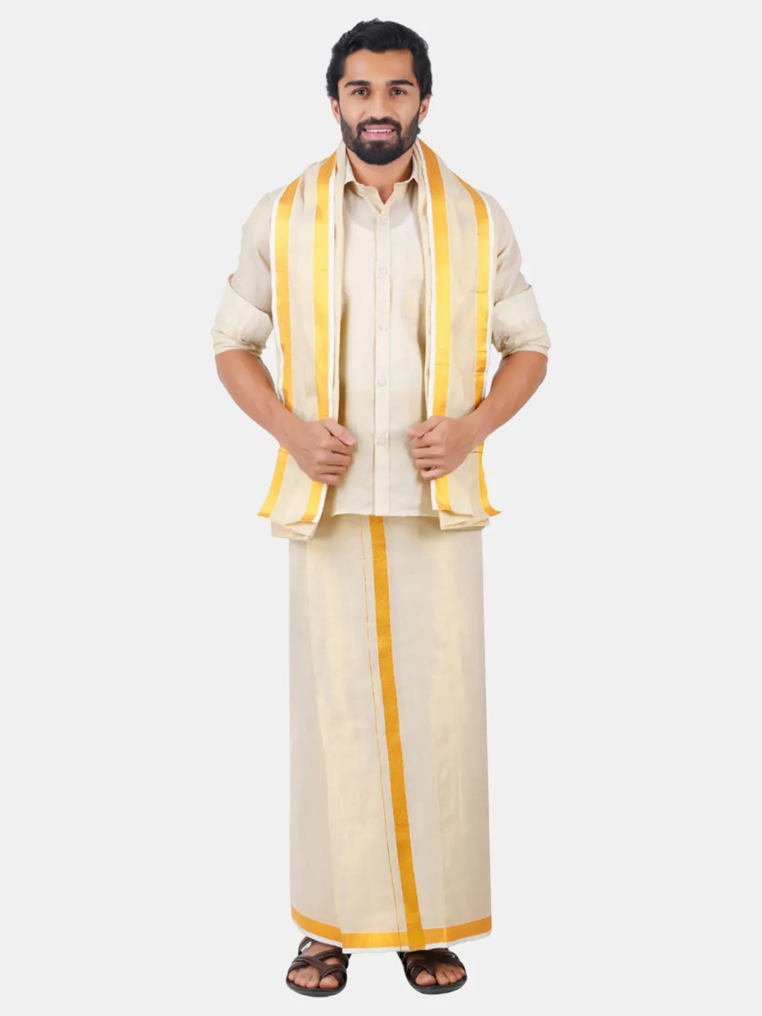 Tissue 3 In 1 Stiched Wedding Set (Full sleeve Shirt, Flexi Readymaade (50K)Tissue-Gold Dhoti, Single Towel)
