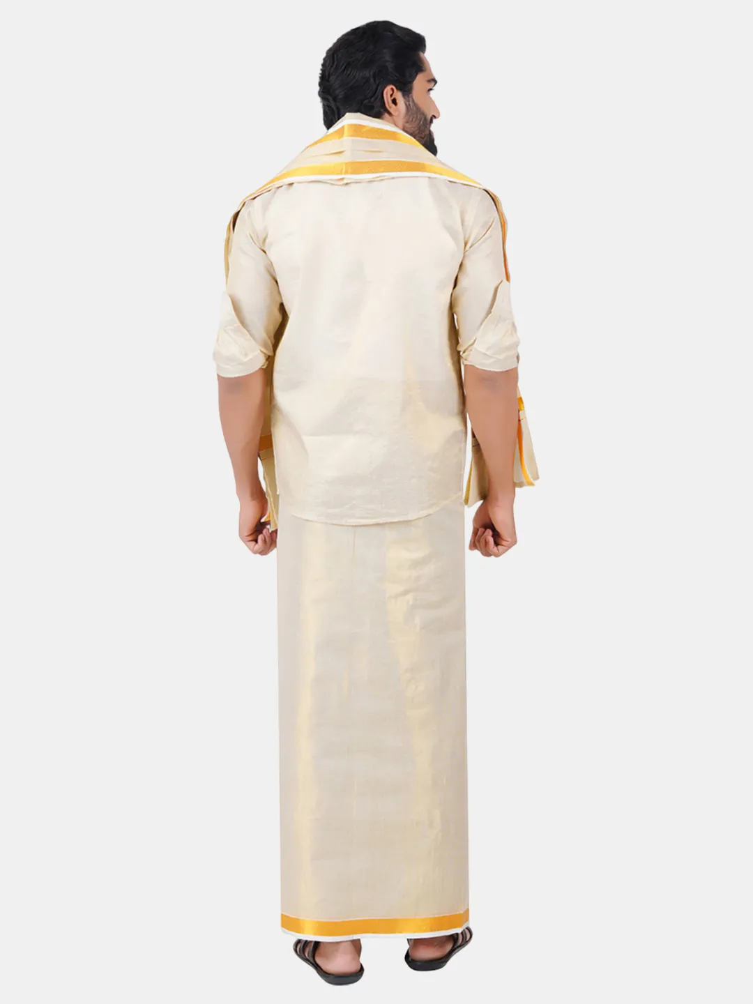 Product Details This versatile piece of fabric is an essential part of a man's wardrobe for weddings. The Mapillai Set contains one tissue gold colour unstitched shirt, one tissue gold colour double (1.28X4.00 mtrs) unstitched dhoti & one tissue gold single 4 yard (1.28X1.80 mtrs) Towel (Angavastram). A perfect wear for wedding combo 3 In 1 pack. Tissue fabric dhotis should be dry cleaned or hand washed with mild detergent to maintain their delicate texture and appearance.