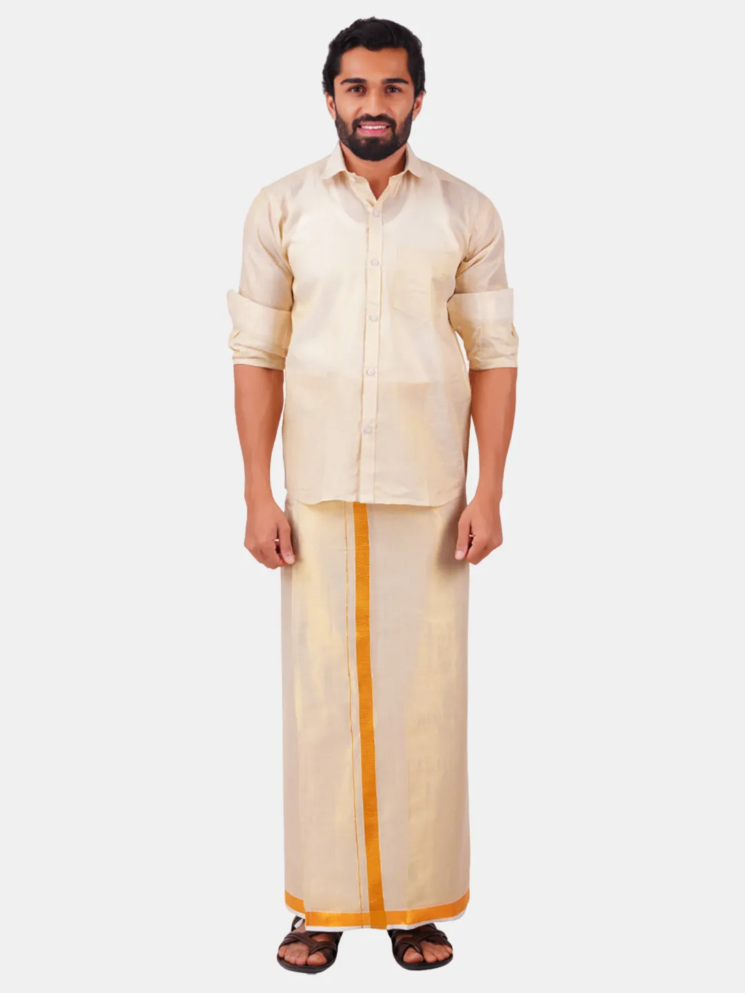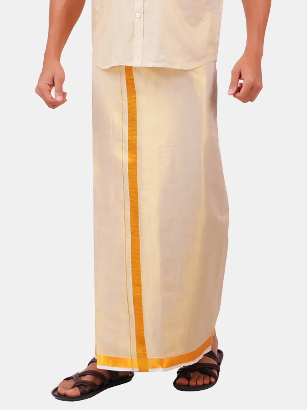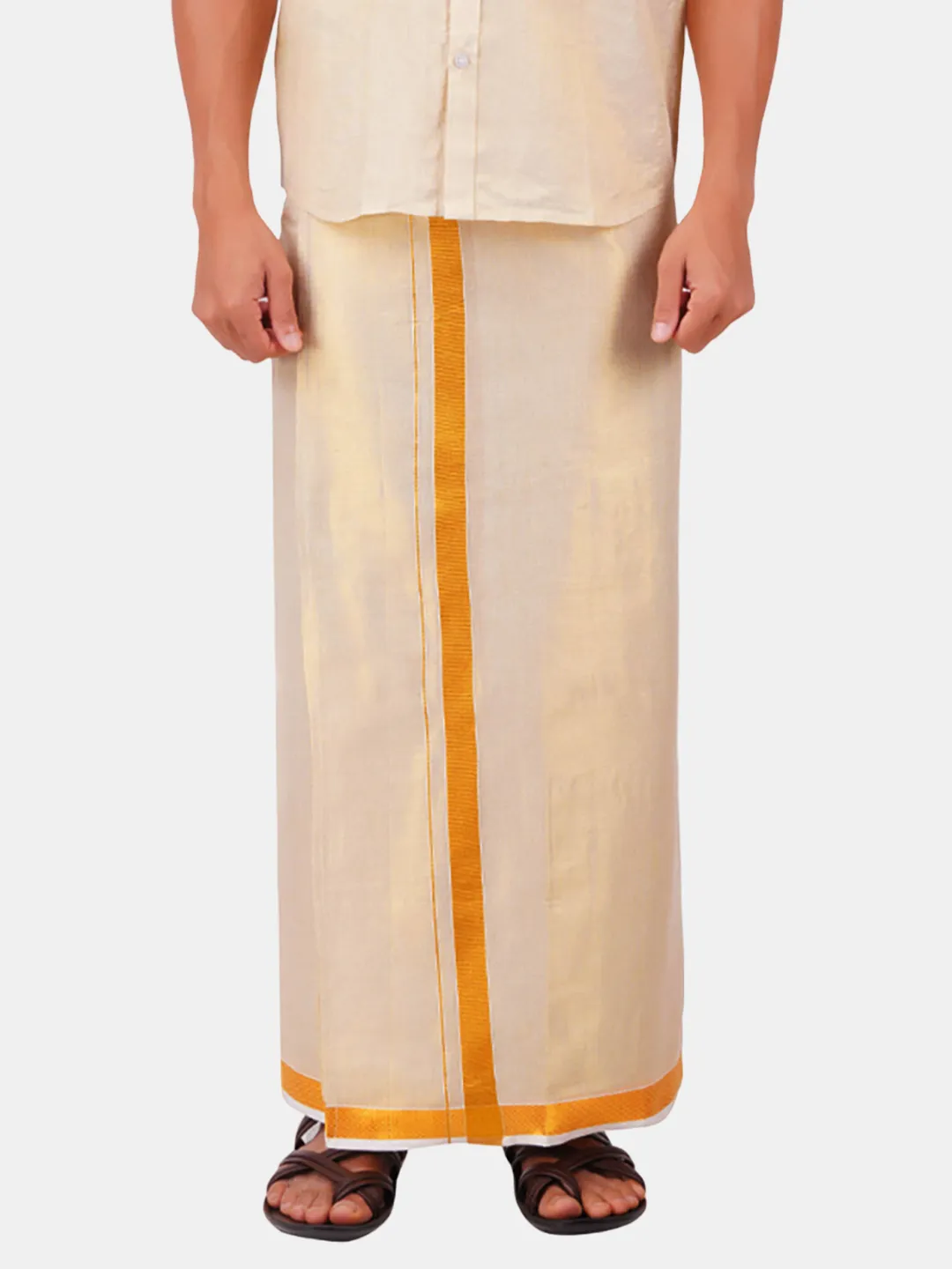 Product Details Men's Premium Quality Tissue gold Jari bordered Double 50K Dhoti. We give you a specially made dhoties that are used for various occasions such as Wedding, Parties, Social gatherings and other Functions. The Quality of the material is made from special quality tissue that makes the fabric rich in colour that makes you standout in any function. Tissue fabric dhotis should be dry cleaned or hand washed with mild detergent to maintain their delicate texture and appearance.